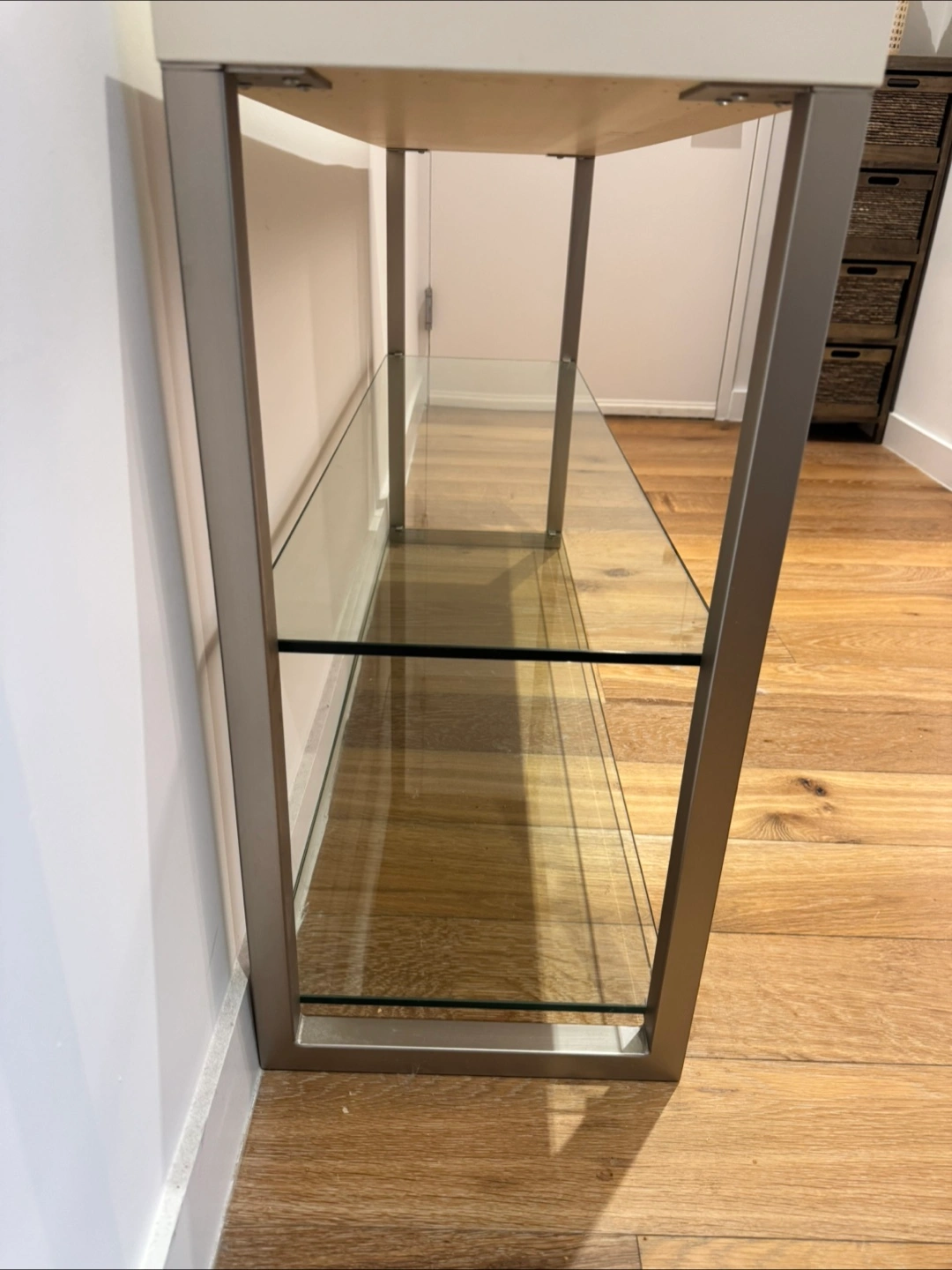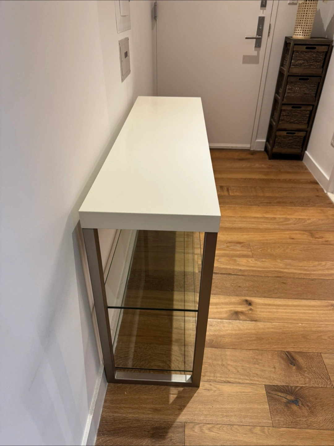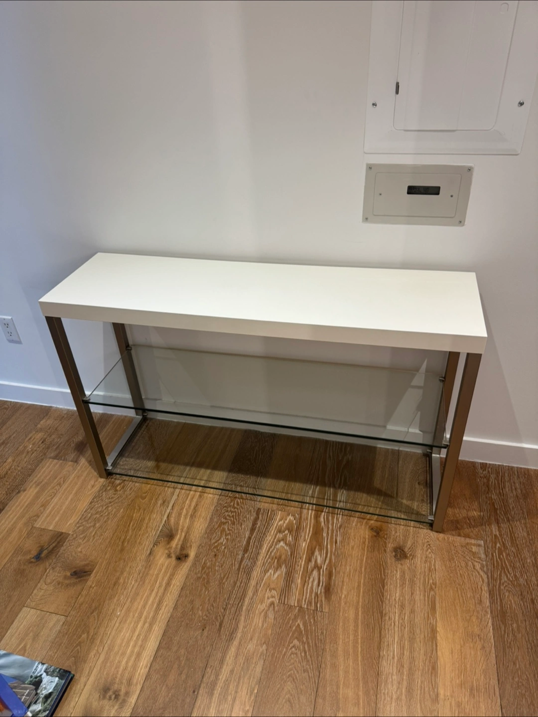 10Sleek and minimalist console table with a glossy white top, tempered glass shelf, and brushed metal frame. Ideal for an entryway, hallway, or behind a sofa. • Dimensions: 47” L x 13” D x 29” H • Glossy white top surface • Lower tempered glass shelf for décor or storage • Brushed metal frame with clean modern lines • Excellent condition A versatile piece that adds style and function to any space. Message if interested!