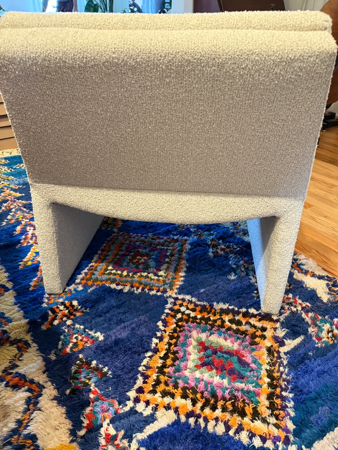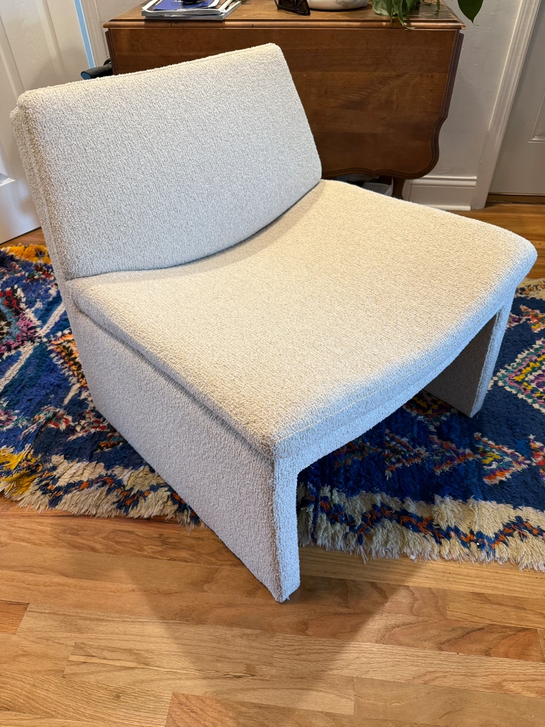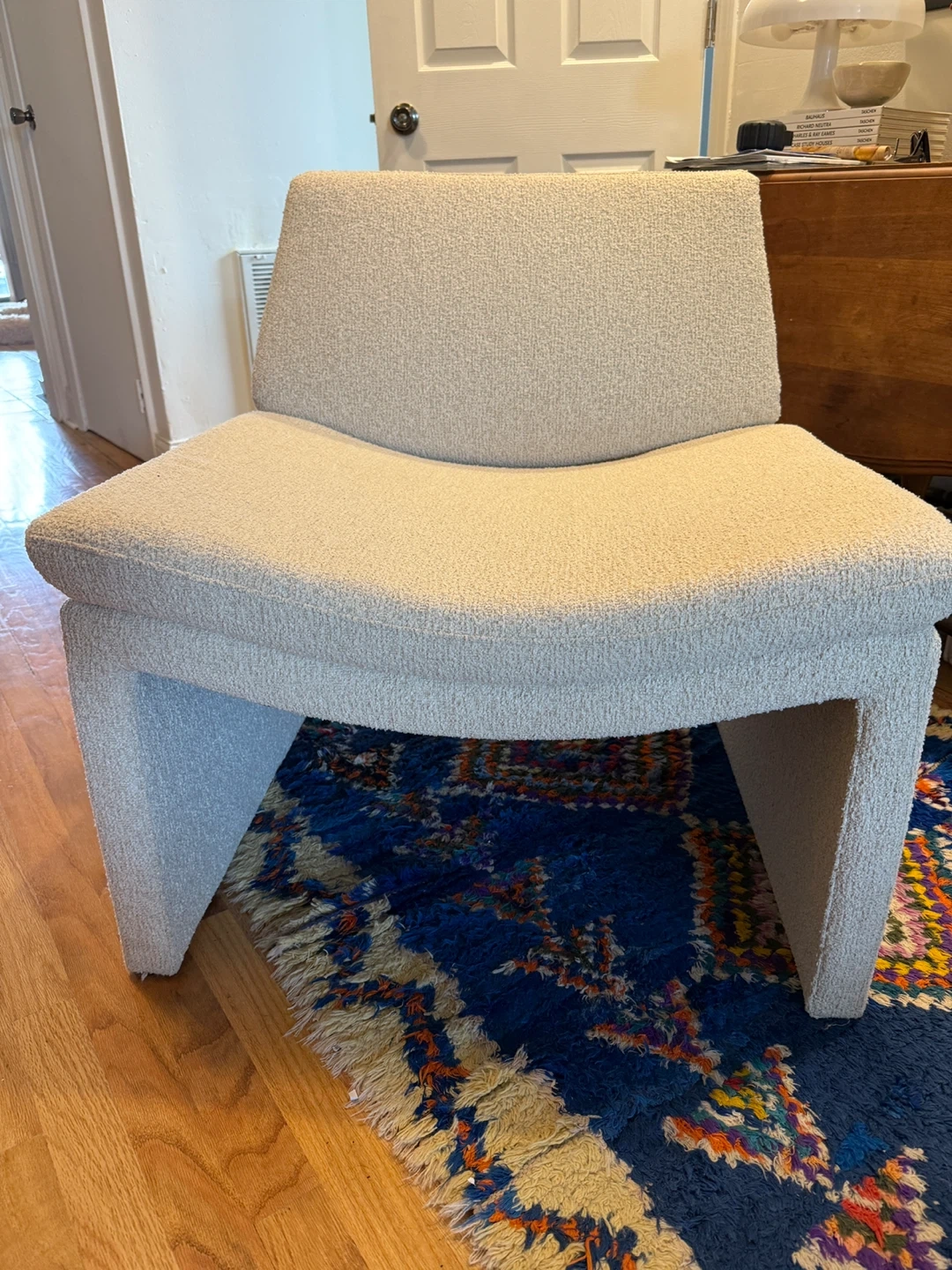 17Modern cream boucle accent chair in perfect condition, only one year old. Upholstered in soft, textured cream colored boucle fabric. The seat is wide and super comfortable. Seat height is 16”.
