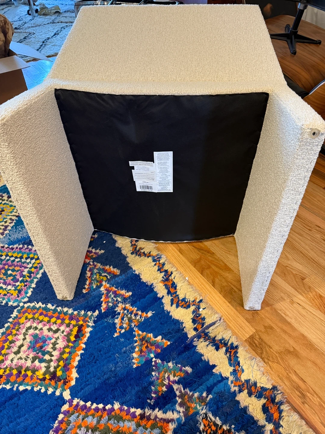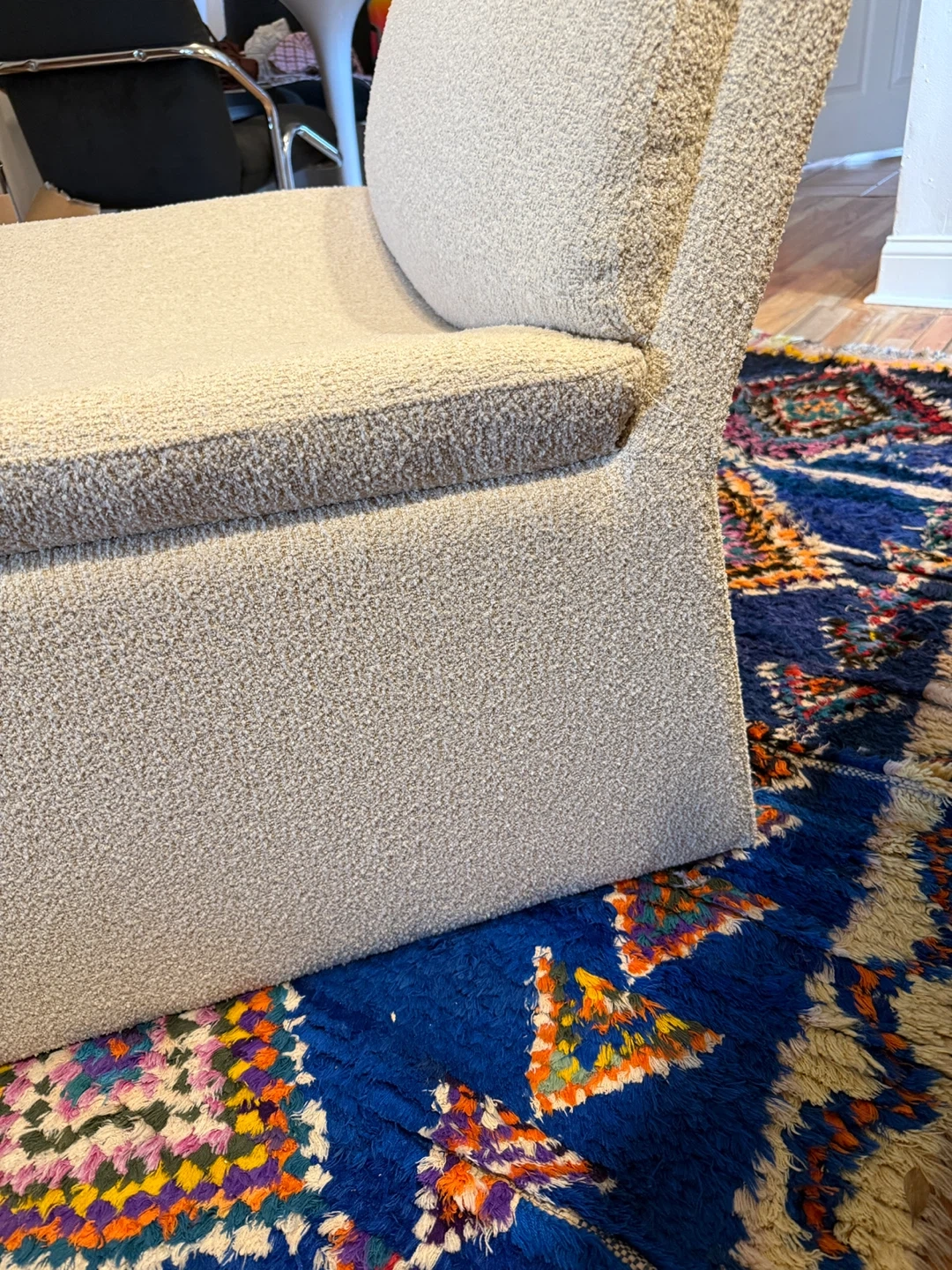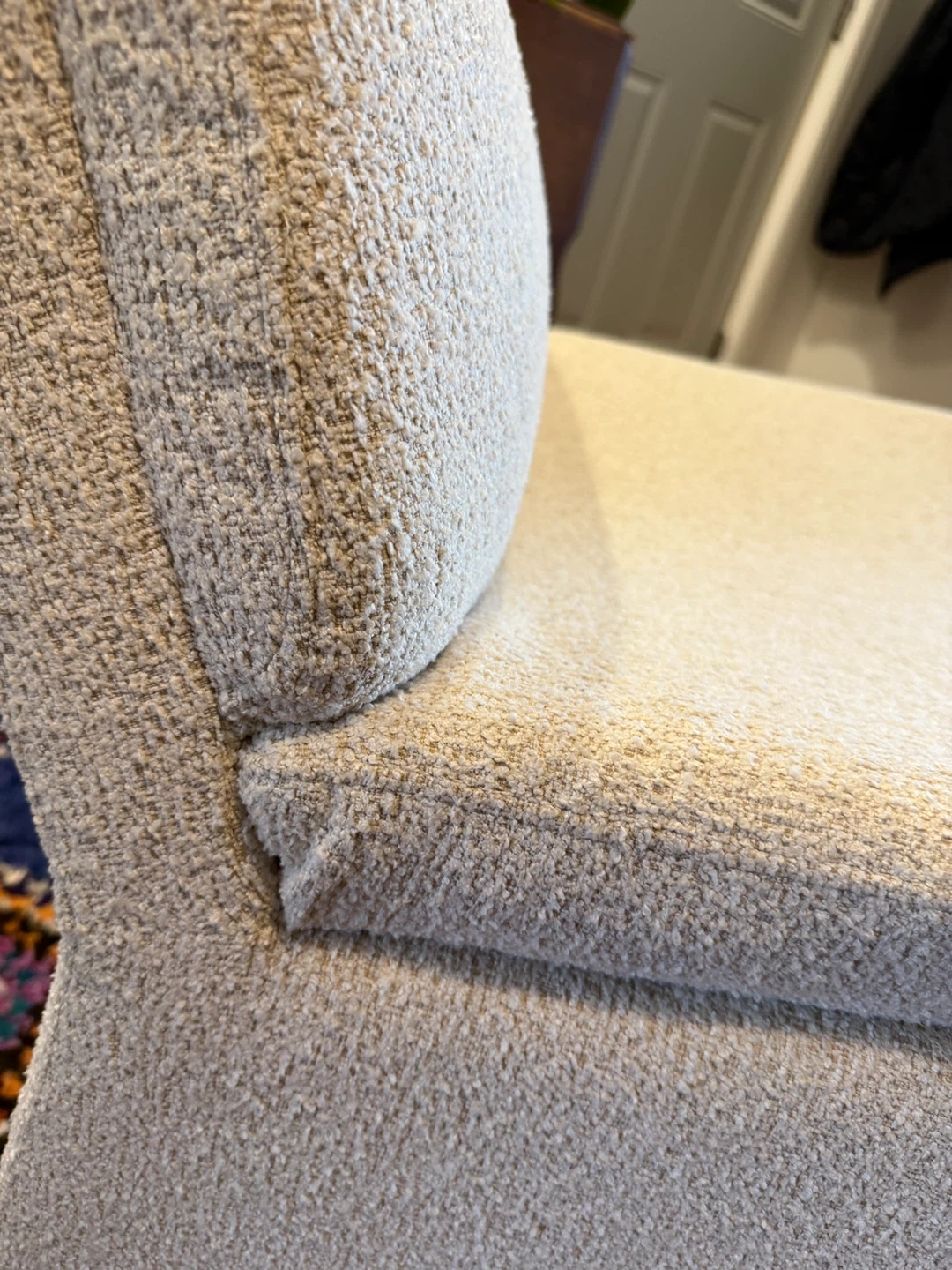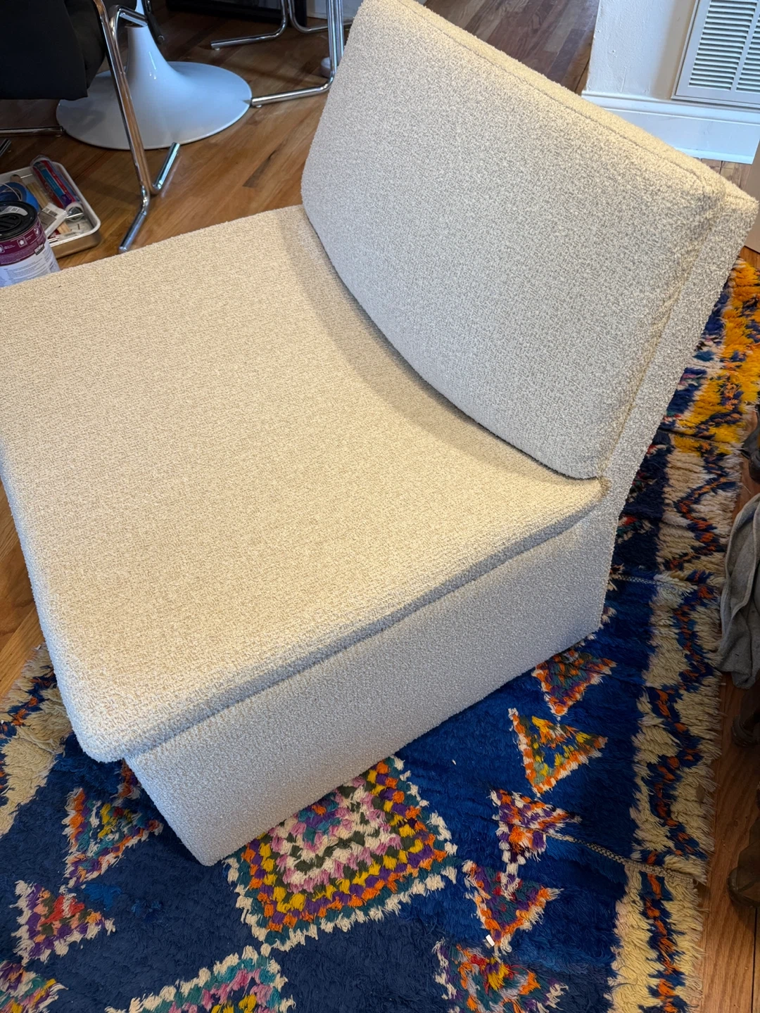 17Modern cream boucle accent chair in perfect condition, only one year old. Upholstered in soft, textured cream colored boucle fabric. The seat is wide and super comfortable. Seat height is 16”.