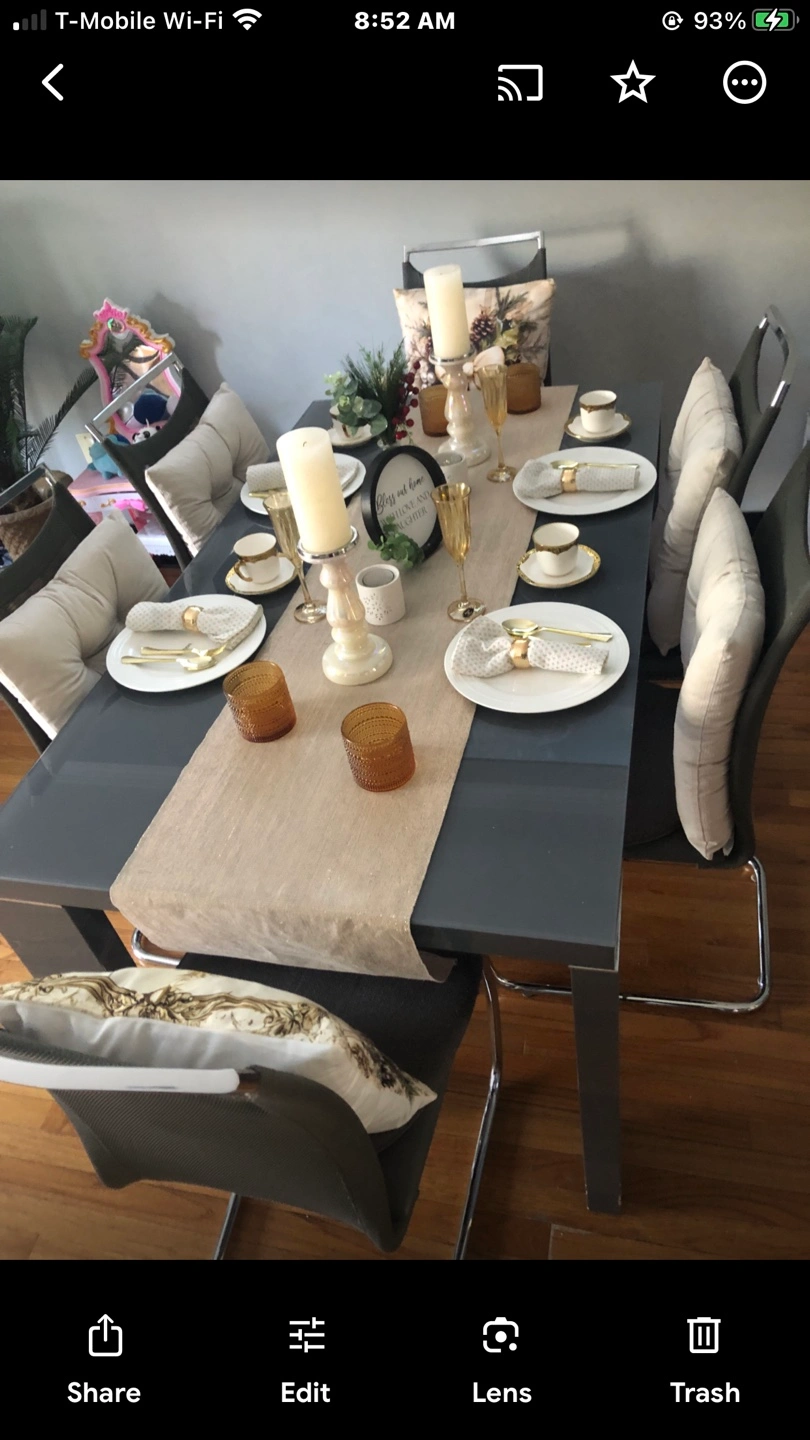 10Sleek dark gray dining table. Six modern chairs included. Chrome legs. Table features a simple design. Glass top