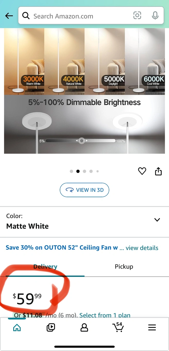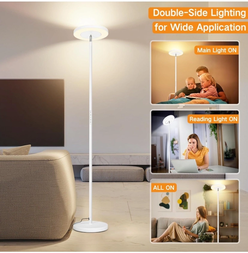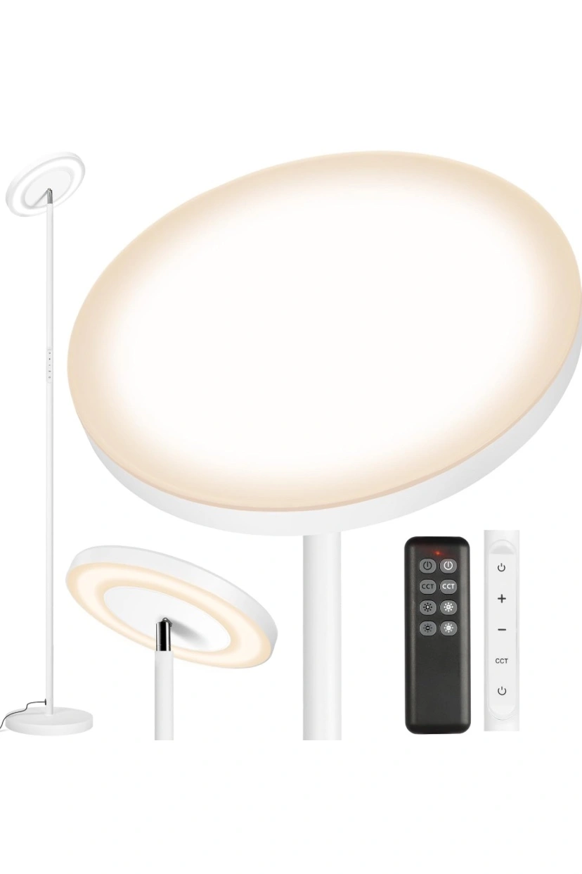 308A white, modern floor lamp with a round, adjustable light fixture. The lamp includes a remote control. The light fixture can be used for a reading light or a general room light