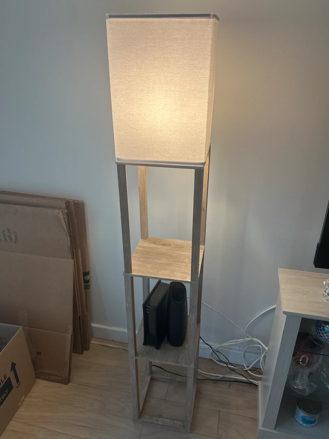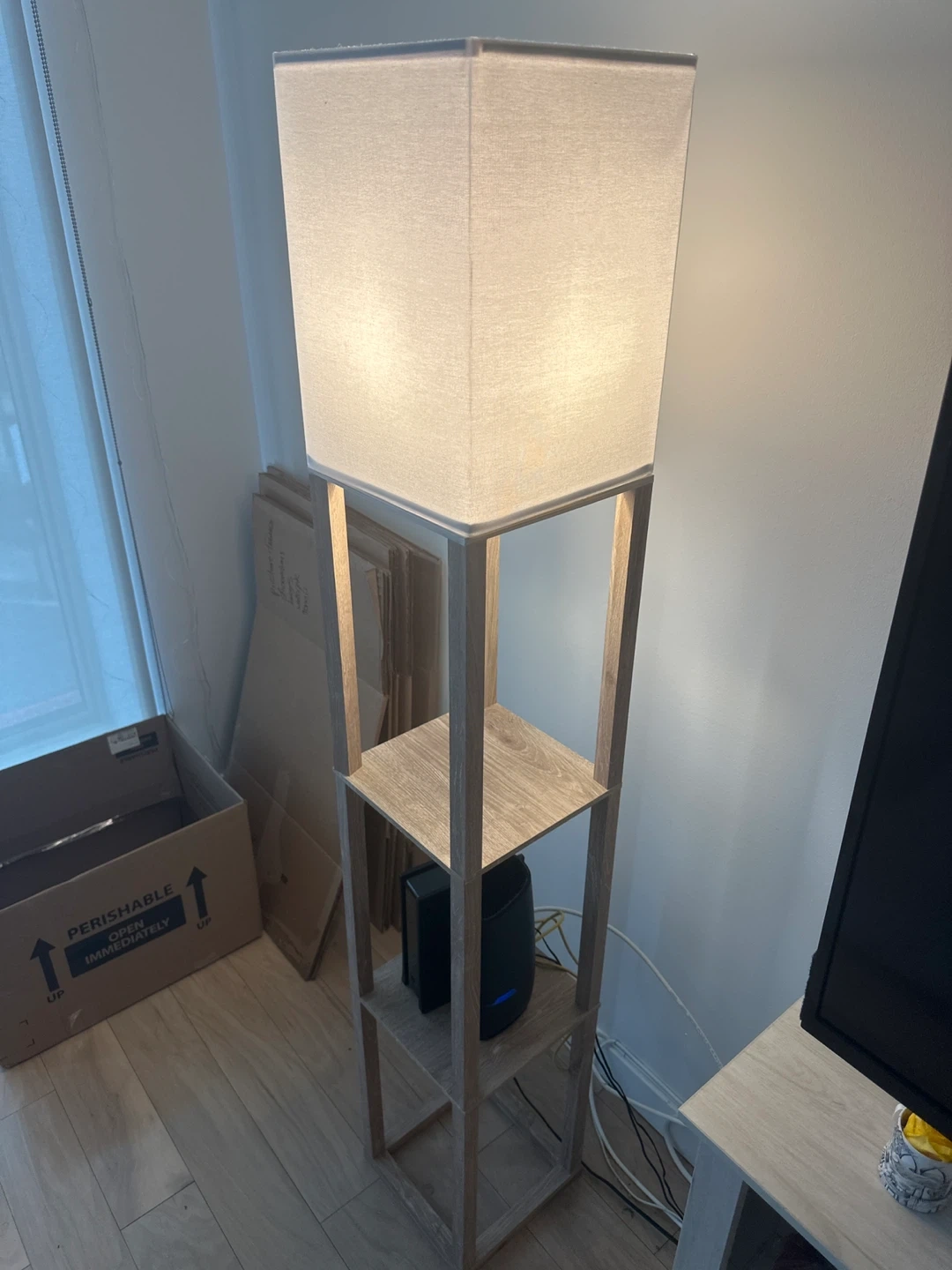 Selling a modern floor lamp with built-in shelves! It's in great condition and adds a nice touch to any room. Perfect for displaying small items or books while providing soft lighting. Moving sale. Pick up please. Thank You!