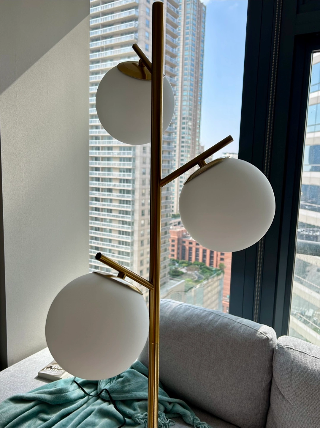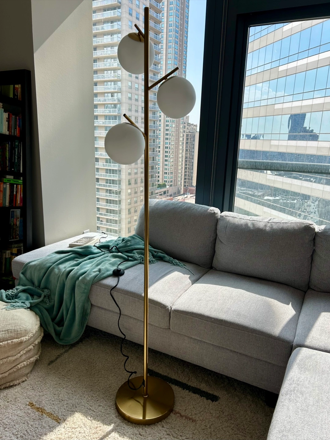 60Selling a modern globe floor lamp with a sleek gold finish! It features three white globe lights that create a warm and inviting ambiance. Perfect for adding a touch of elegance to any room. It's in great condition and ready to brighten up your space! Lightbulbs are included.
