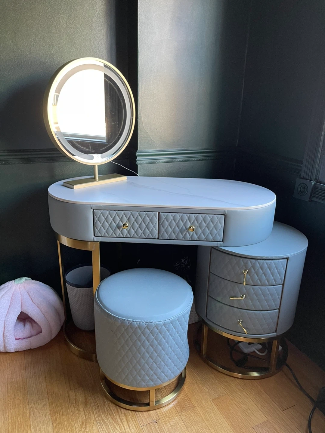 65Modern gray and gold vanity set with quilted details and a marble-style top. Comes with a matching cushioned stool and a sleek LED lighted mirror, perfect for makeup or getting ready in style. Features multiple drawers for organized storage and a sturdy metal base that adds both elegance and durability. Excellent condition—used gently and very well maintained. A chic, contemporary statement piece that instantly elevates any bedroom or dressing area.