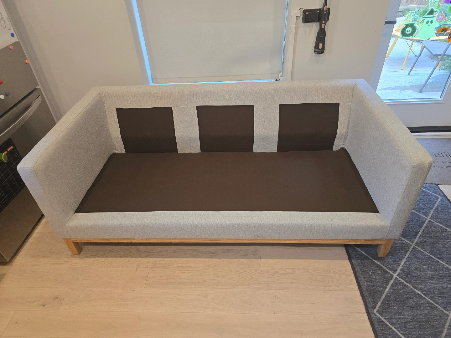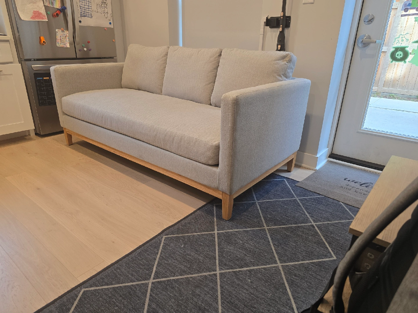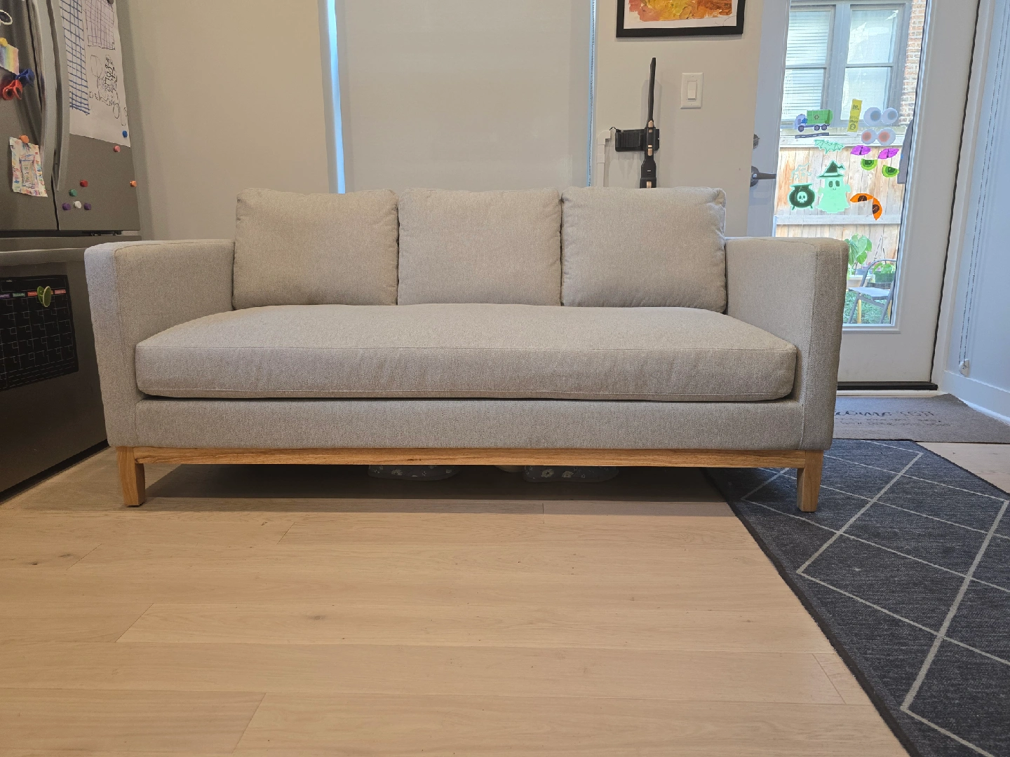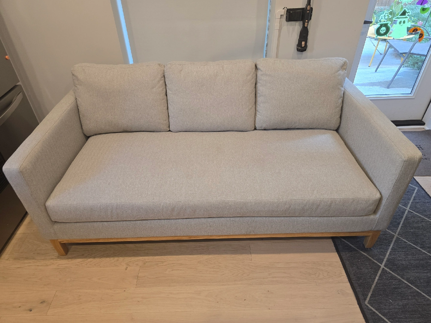 65Selling a modern sofa in grey. It's in great condition and would look great in any living room! The sofa features a clean, minimalist design with a light wood base. It's a comfortable and stylish piece of furniture. No stains and only minor wear and tear. Note: cannot be disassembled but I can help load into vehicle.