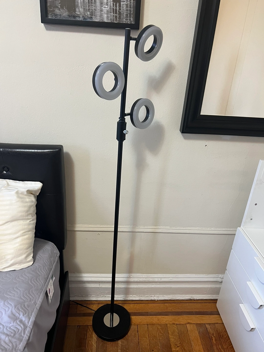 17Sleek black metal floor lamp. Features three adjustable circular LED lights. Perfect for a bedroom or living room. Easy to assemble and use.