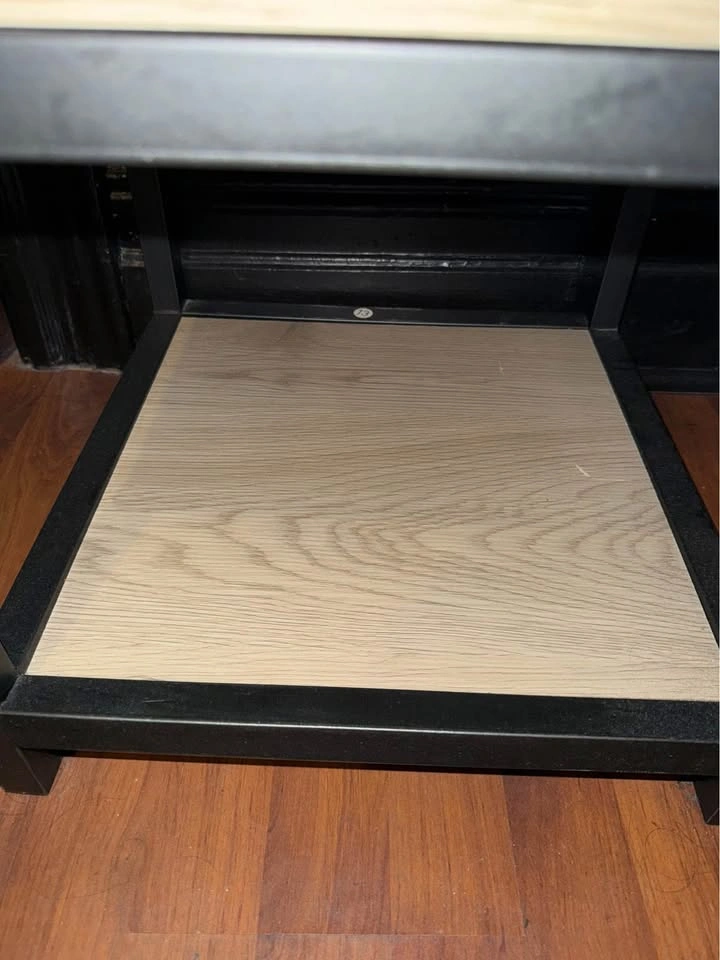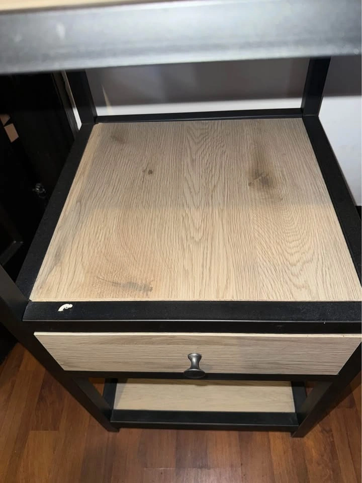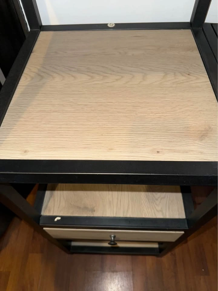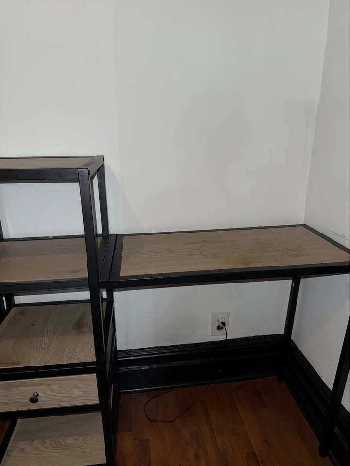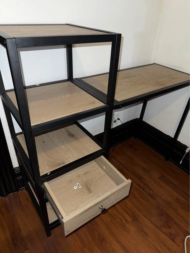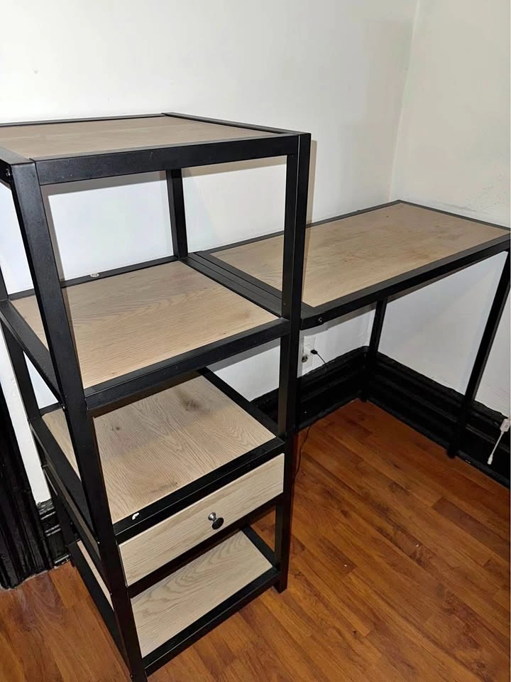 Modern Shelf & Desk Set Sturdy black metal frame with light wood shelves and drawer. Great for home office or storage. ๐ 47 1/2โL x 16 1/8โW (table 30โL, shelves 16 1/8โx16 1/8โ) Great condition. ๐ Pickup in Ridgewood asap