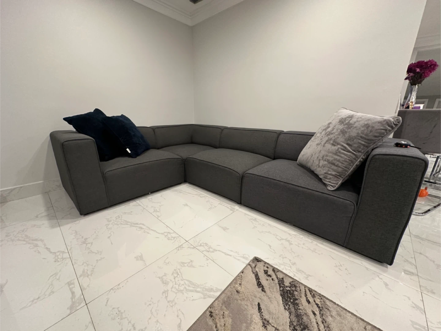 10Modern modular sectional grey couch cushion 5-pc 90” Comes with extra piece than photographed. Dimensions PER Piece - 34in. x 43in. x 16in. seat (27 in. arm/head rest) Cushion sofa pieces can be shaped in customized order. Selling a comfortable gray modular sectional sofa! It's in great condition and ready to add a cozy touch to your living space. The modular design allows for flexible arrangement to fit your room perfectly