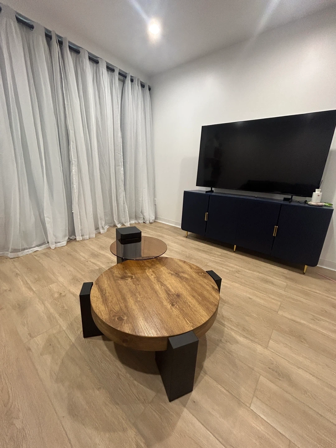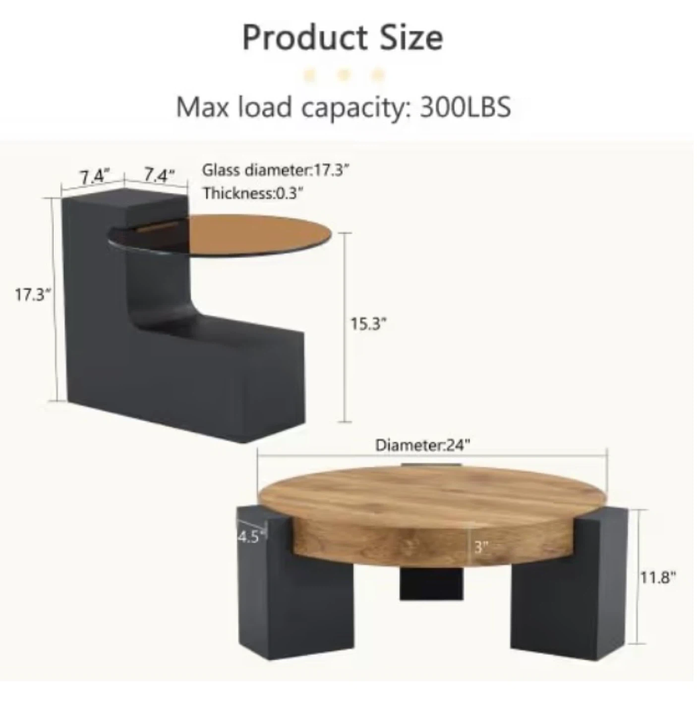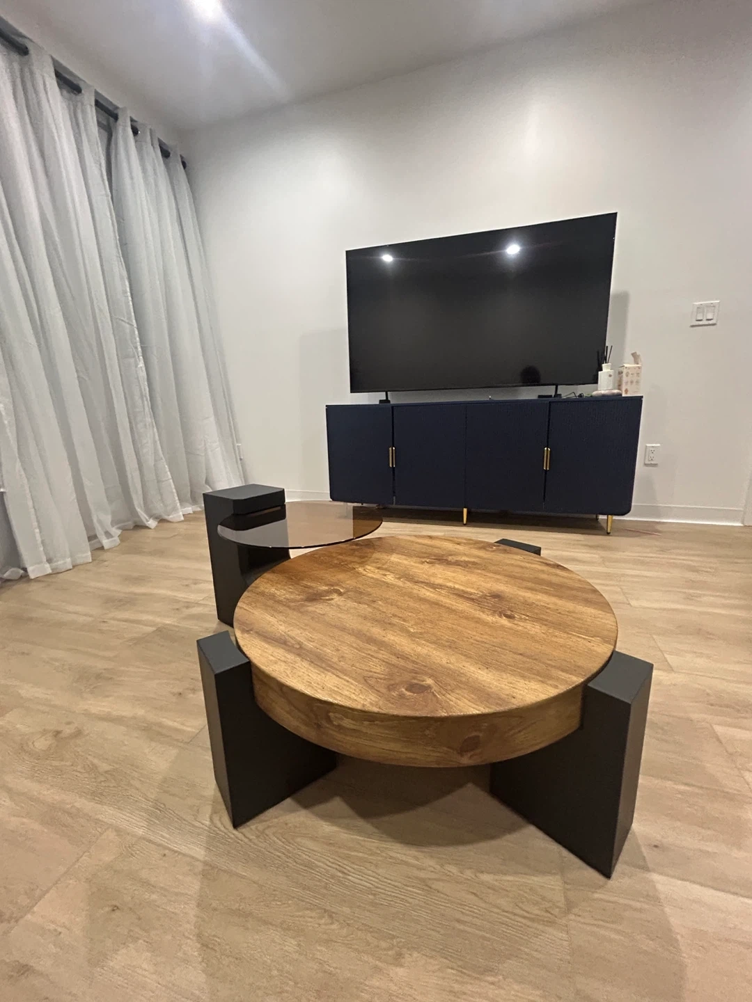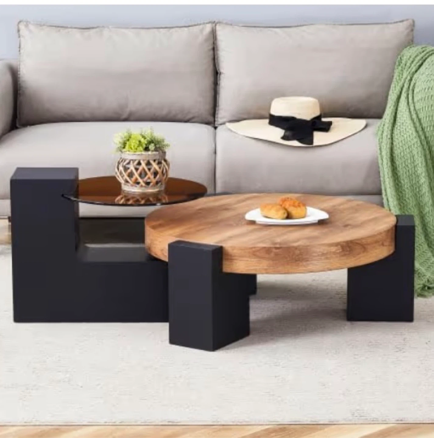 68Selling a modern coffee table with a unique tiered design. It features a round wooden top and a smaller glass side table. Brand new!! It is too small for my liking Note: it is smaller than it looks in the picture, the diameter of the wooden tier is 24”
