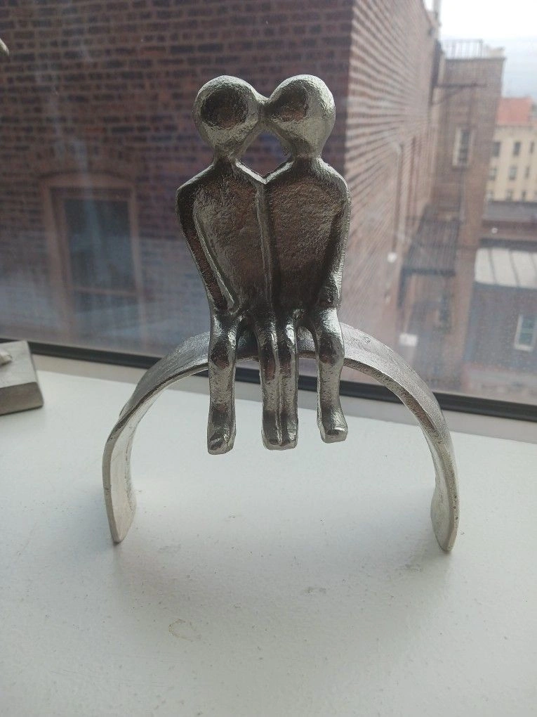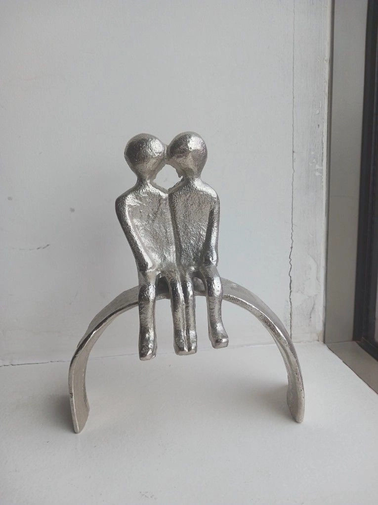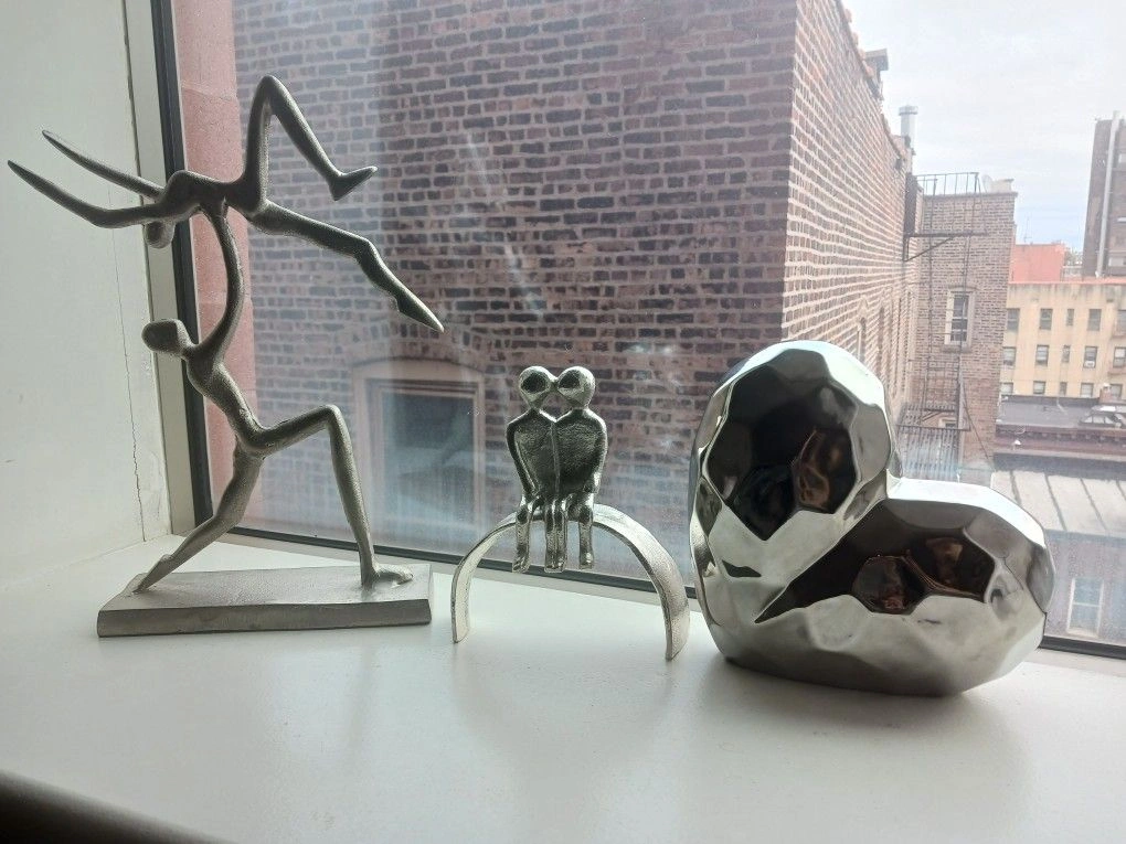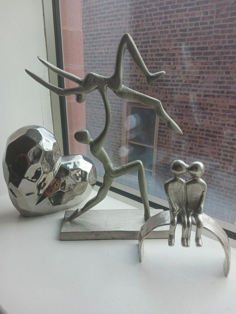 Elegant 3-piece modern sculpture set featuring abstract couple figures and a faceted heart accent. Crafted with metallic silver finishes for a sophisticated, contemporary look. Perfect for shelves, desks, or window displays. Adds an artistic and emotional touch to any space. ✨ Details: Includes 3 sculptures (heart + 2 abstract couples) Sturdy metallic construction Modern, minimalist style Ideal for collectors or home décor lovers Condition: Excellent Serious buyers only | No lowball offers | No refunds Pick-up in Bronx, NY Size: Medium (up to 36 in) Originality: Limited edition Style: Statue Medium: Metal Placement: Table