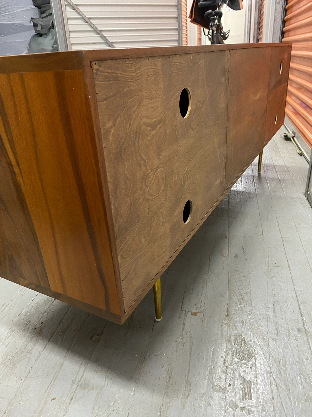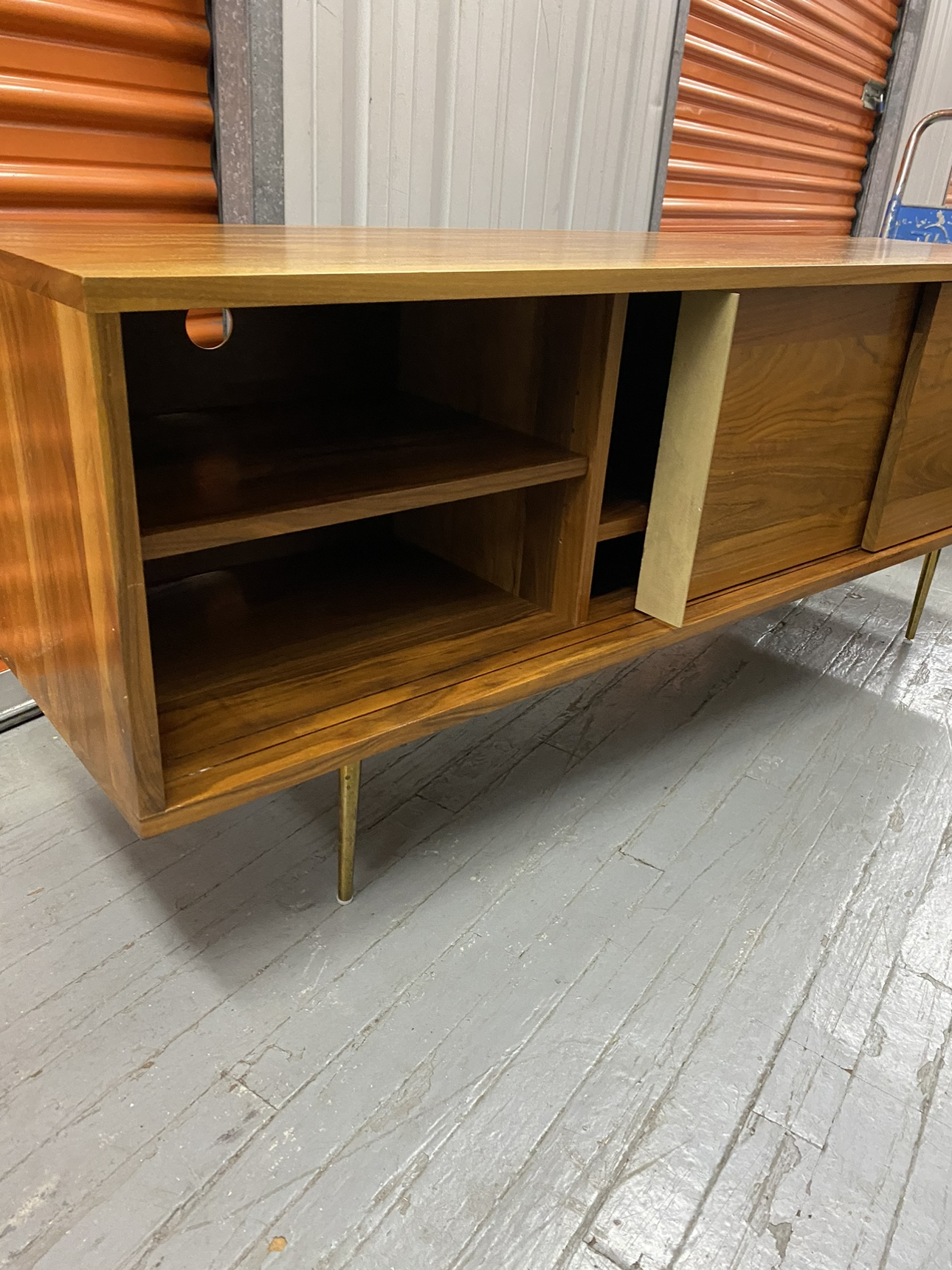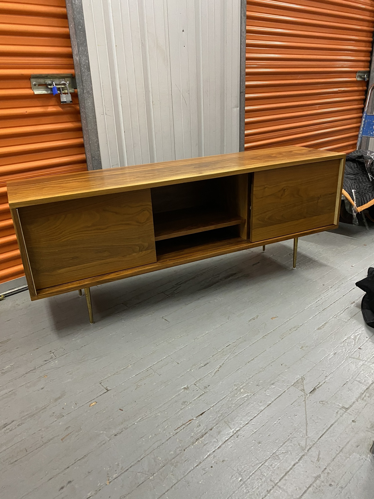 Selling this solid walnut tv console. It was a custom piece from STOR New York. Measurements: 60” long 16” deep 23” high Body is 15” and legs are 8” Details: Three separate sections, two sliding doors on two tracks. Three shelves all adjustable/removable. Solid brass legs and brass door handles. Has some scratches which are shown in the photos. Originally paid $2,200 for it. It’s in my storage unit in LIC. I will help you load it in to your vehicle!
