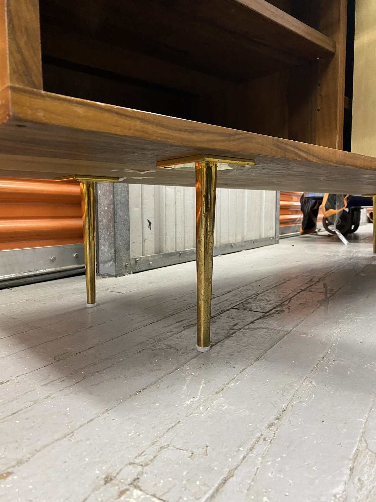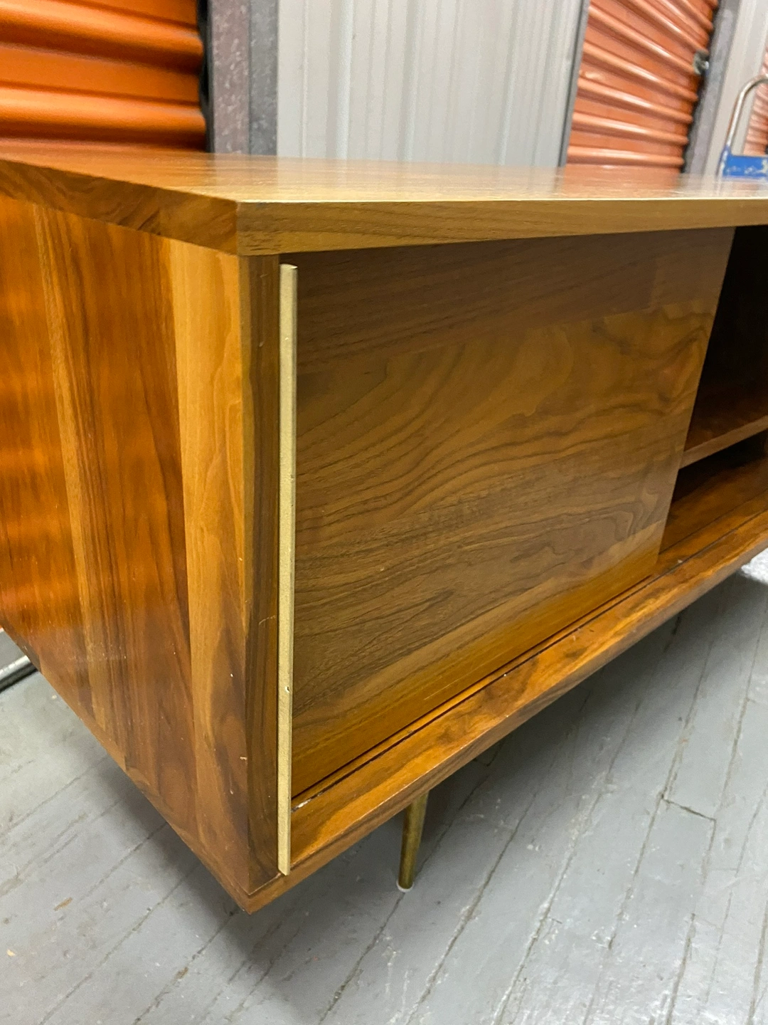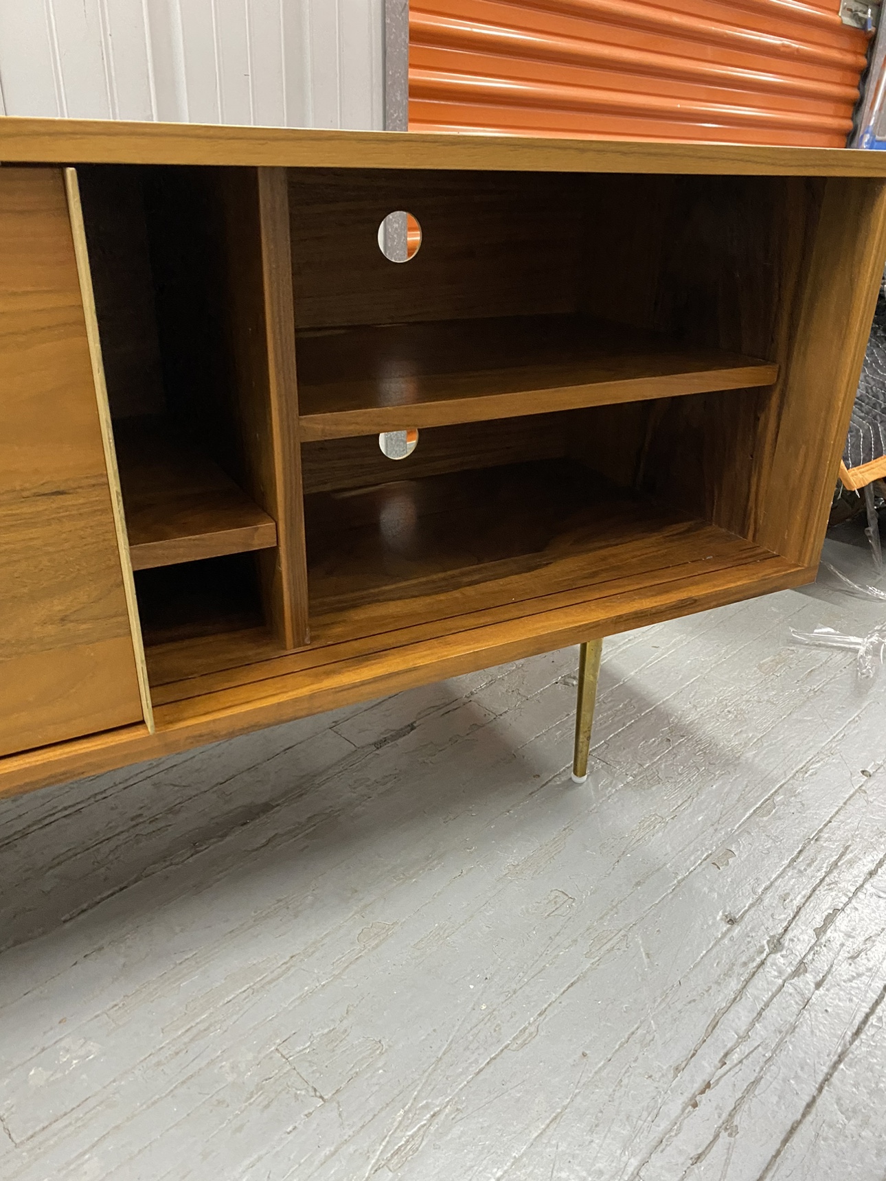 Selling this solid walnut tv console. It was a custom piece from STOR New York. Measurements: 60” long 16” deep 23” high Body is 15” and legs are 8” Details: Three separate sections, two sliding doors on two tracks. Three shelves all adjustable/removable. Solid brass legs and brass door handles. Has some scratches which are shown in the photos. Originally paid $2,200 for it. It’s in my storage unit in LIC. I will help you load it in to your vehicle!