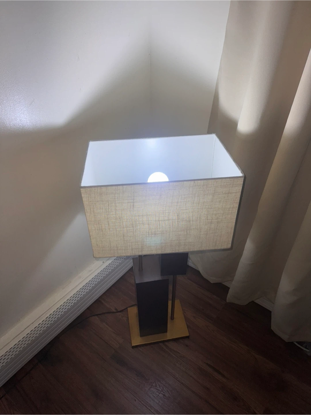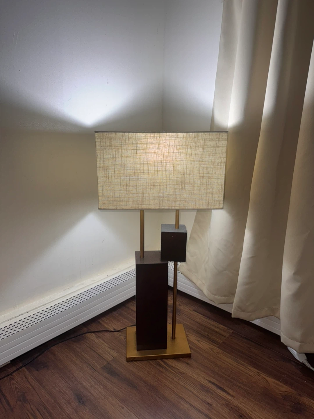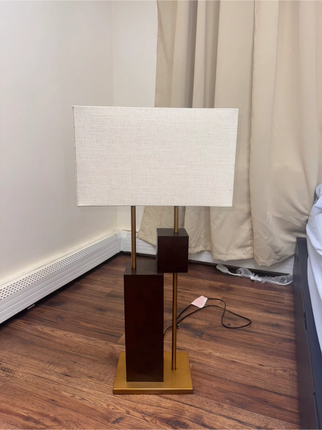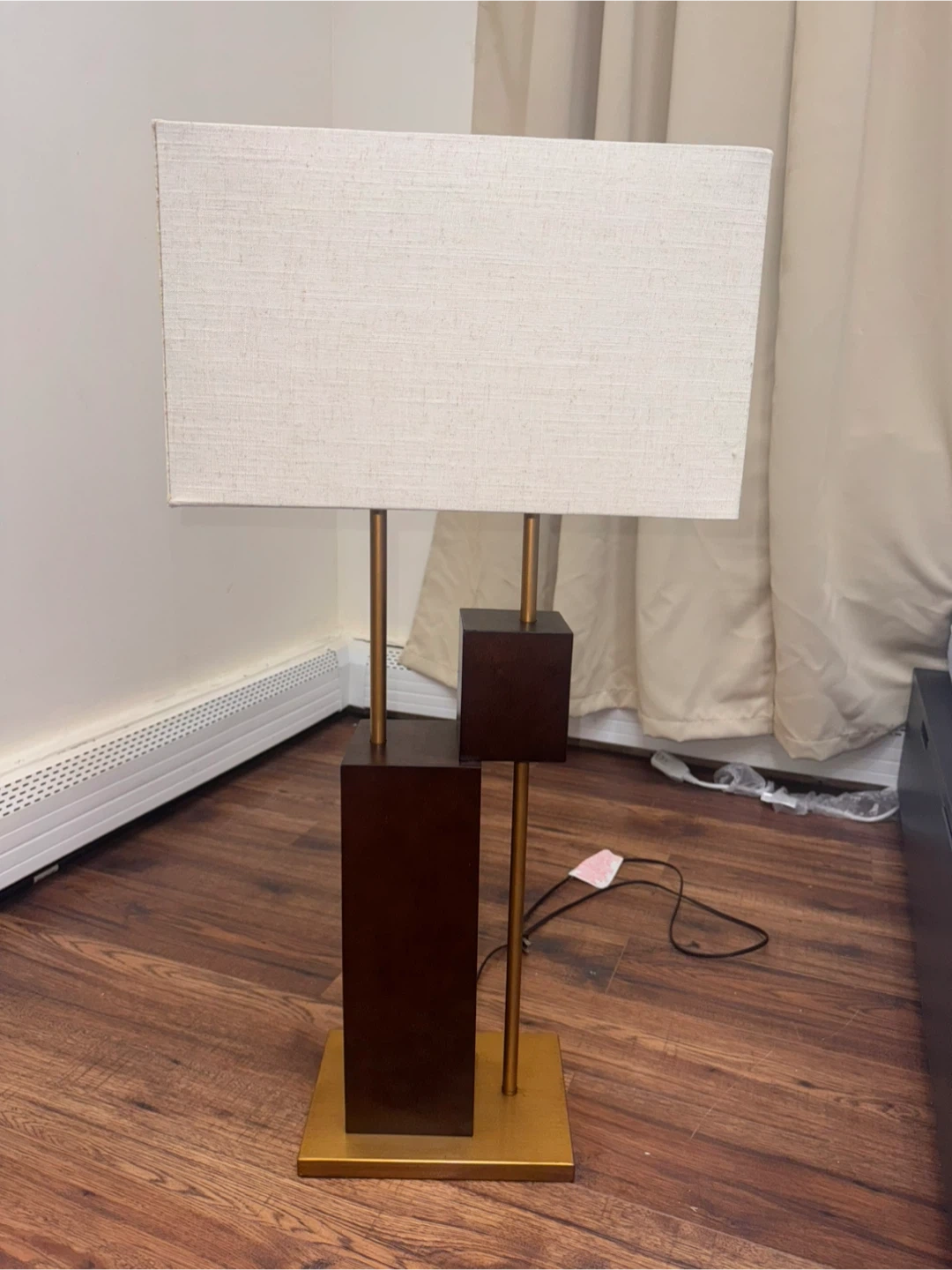 Add a touch of sophistication to your space with this modern geometric table lamp. The mix of bronze, gold, and cream tones gives it a stylish and elegant look that fits any bedroom, living room, or office. Details: • Color: Bronze base with gold accents • Shade: Rectangular linen fabric in off-white • Height: ~26 inches • Style: Modern / Contemporary • Works perfectly – bulb included • Clean and ready to use 💡 Provides warm, ambient light for a cozy feel. 📦 If you see this listing, it’s available.