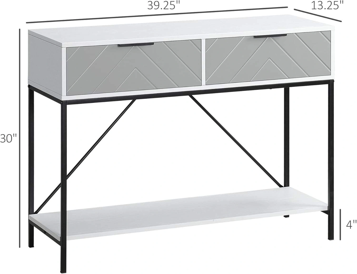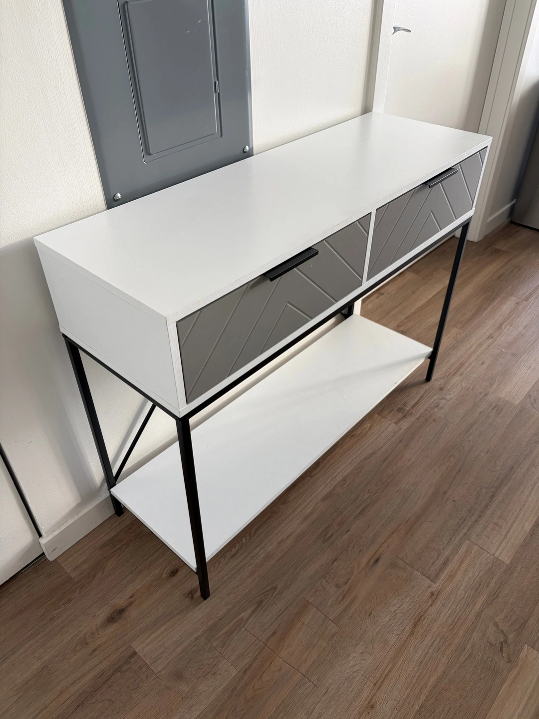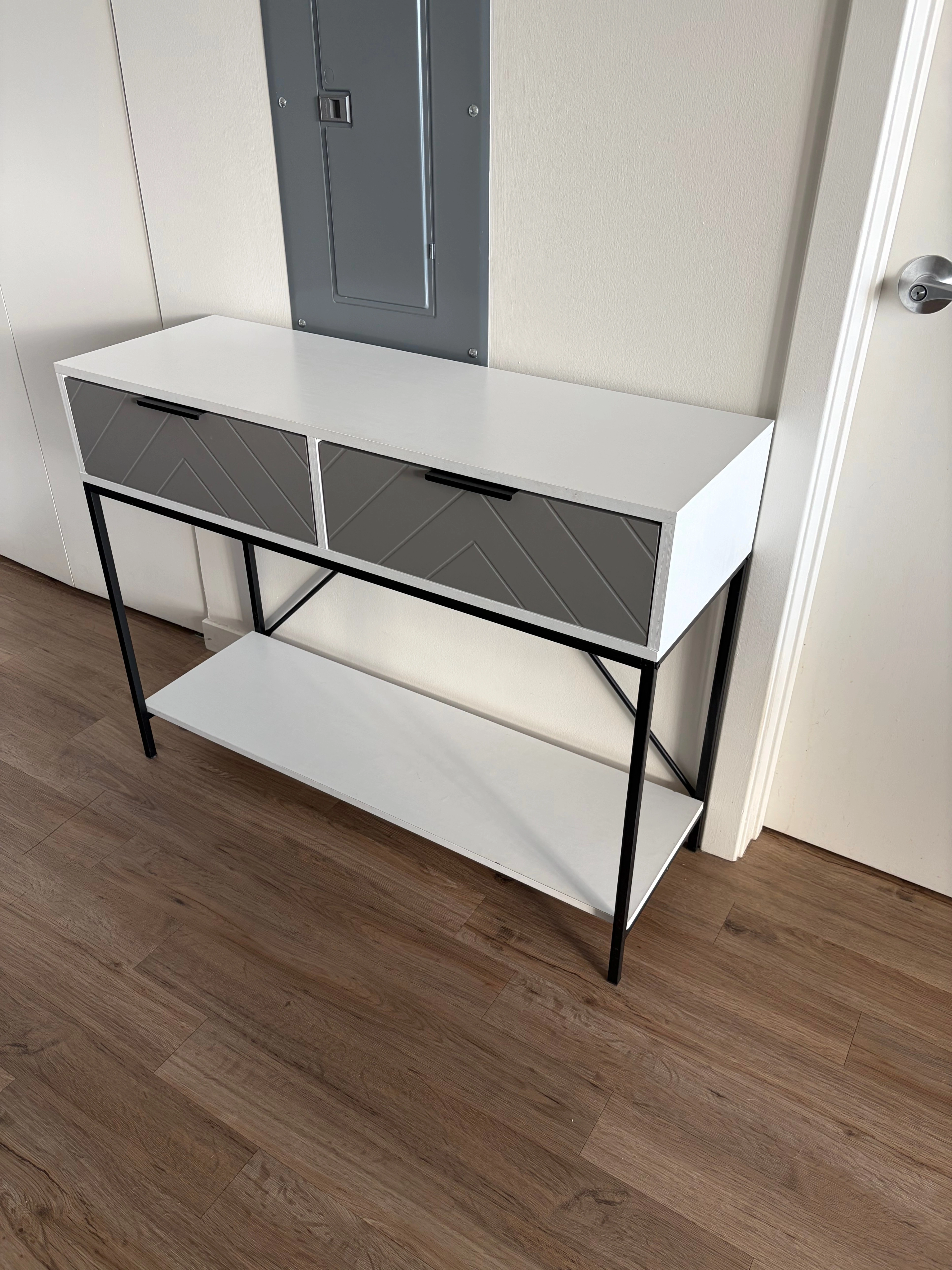 57Functional and stylish HOMCOM Modern Console Table with a great look for an entryway, living room, or hallway. This table is in good, used condition and shows normal signs of wear, including a few minor scratches on the top. It is solid, clean, and the two drawers open and close smoothly. Stylish Design: Crisp White finish with a modern herringbone pattern on the drawer fronts and black metal legs. Storage: Large top surface, two spacious drawers, and an open shelf for bins or books. Condition: Good condition with visible wear (reflected in the price). Original Price: $80. Asking Price: $30 OBO. Pickup: Local pickup only in Lake View East / Wrigleyville. Payment: Cash or Venmo