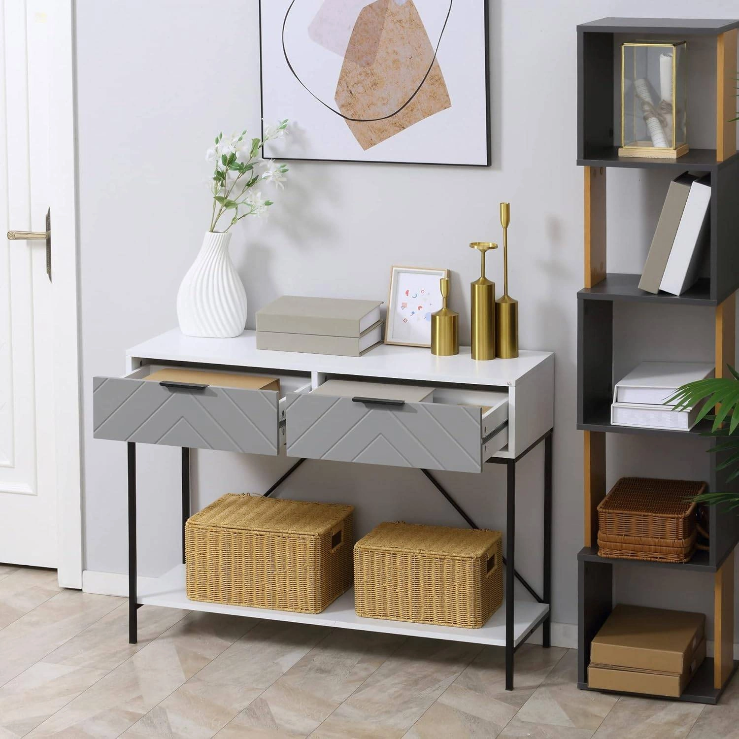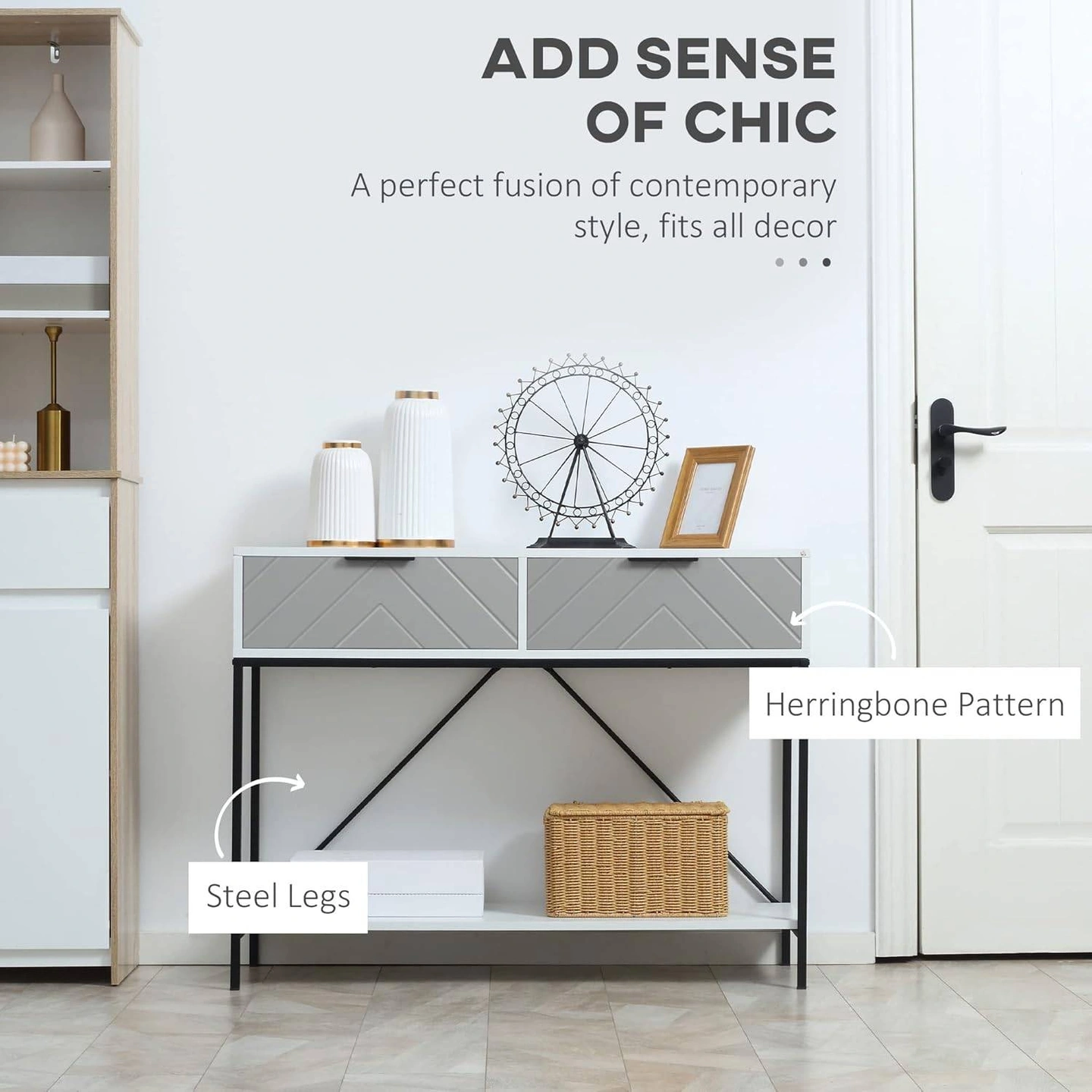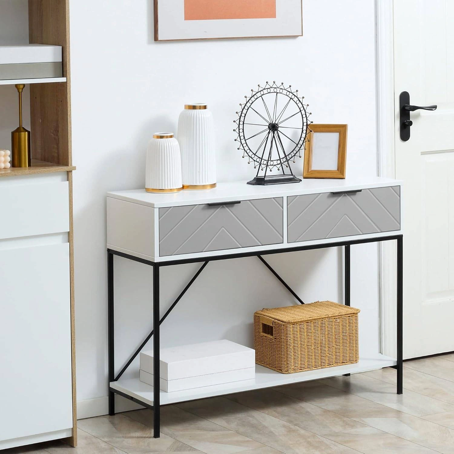 57Functional and stylish HOMCOM Modern Console Table with a great look for an entryway, living room, or hallway. This table is in good, used condition and shows normal signs of wear, including a few minor scratches on the top. It is solid, clean, and the two drawers open and close smoothly. Stylish Design: Crisp White finish with a modern herringbone pattern on the drawer fronts and black metal legs. Storage: Large top surface, two spacious drawers, and an open shelf for bins or books. Condition: Good condition with visible wear (reflected in the price). Original Price: $80. Asking Price: $30 OBO. Pickup: Local pickup only in Lake View East / Wrigleyville. Payment: Cash or Venmo