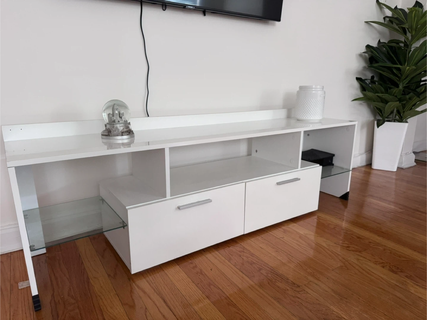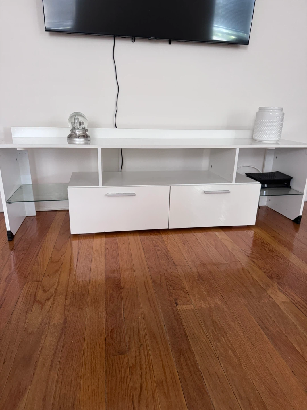 60Sleek and contemporary white TV stand in excellent condition. Features a glossy finish with glass side shelves and two spacious drawers for storage. Perfect for holding a TV, media devices, décor, and more. Fits TVs up to approximately 65 inches Includes two pull-out drawers with silver handles Open shelves for easy cable access and organization