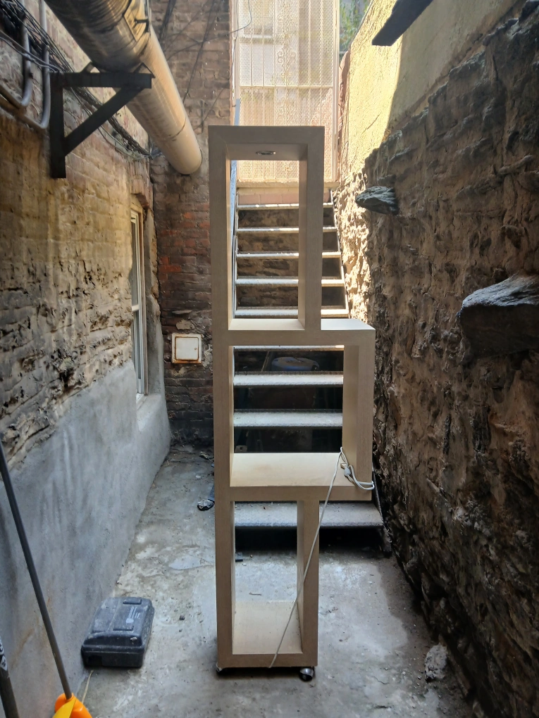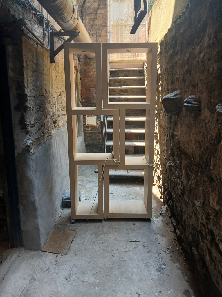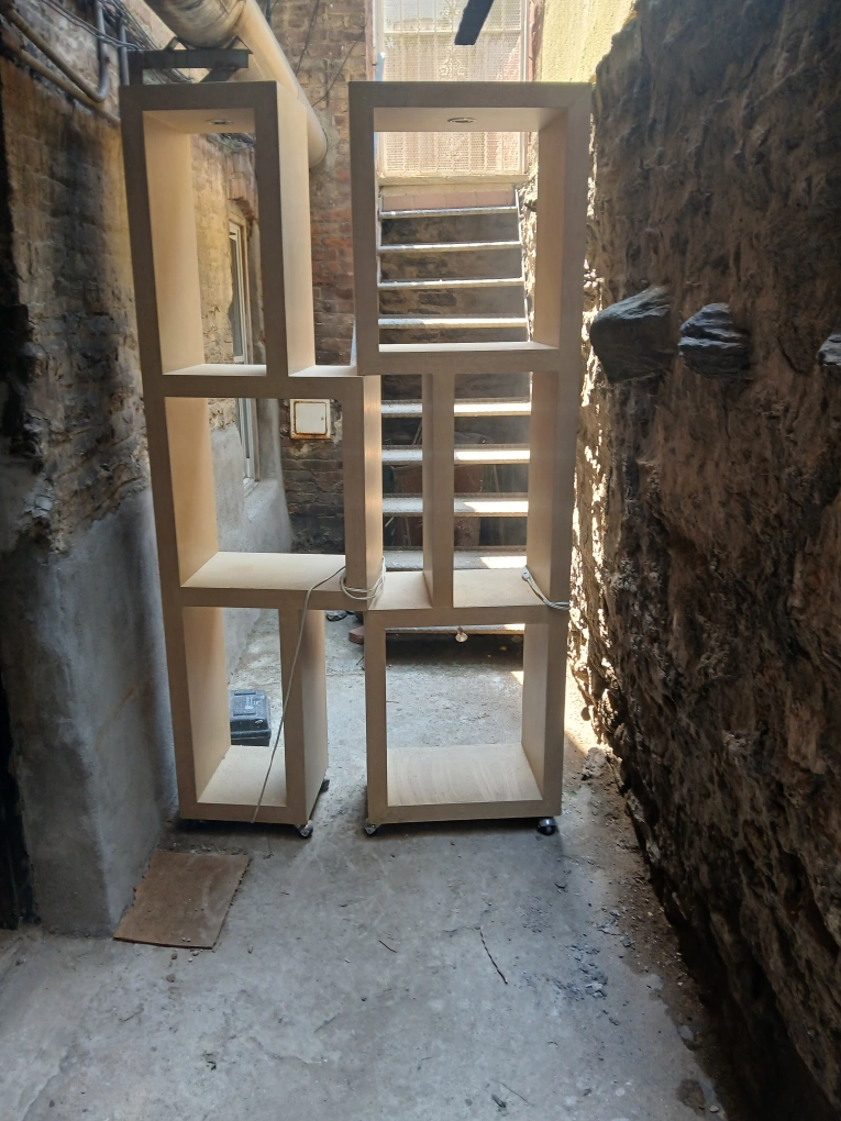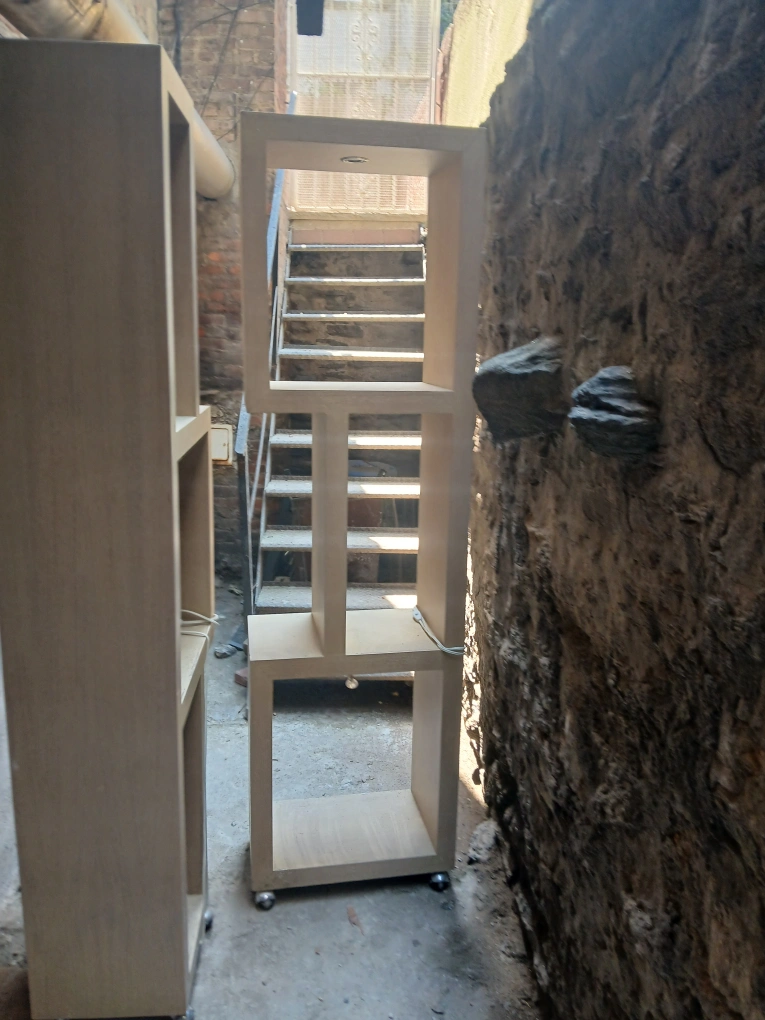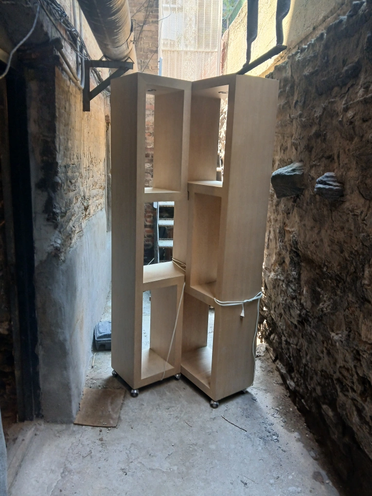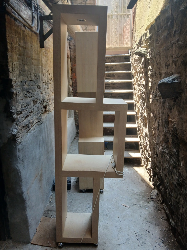Selling a modern wooden display shelf. It's in great condition and ready for a new home. Perfect for displaying your favorite items or adding a unique touch to your shop or home shown is 2 of 4 pieces A pair is designed to connect or used individually asking $1,500 for all 4 seen same units online new at $3500 each huge pieces approximately 7 foot tall not for everyone