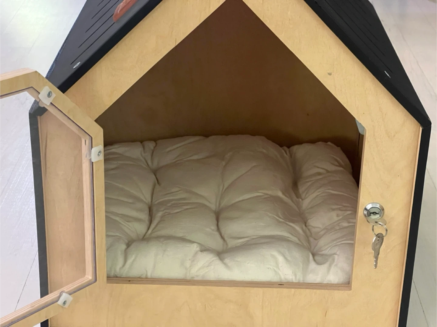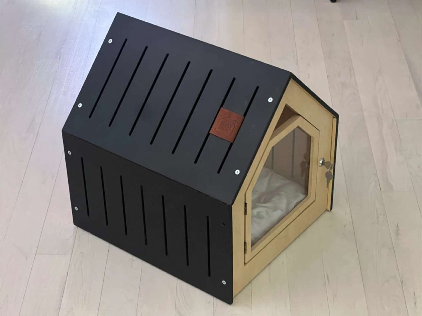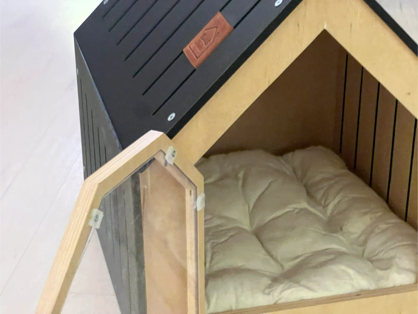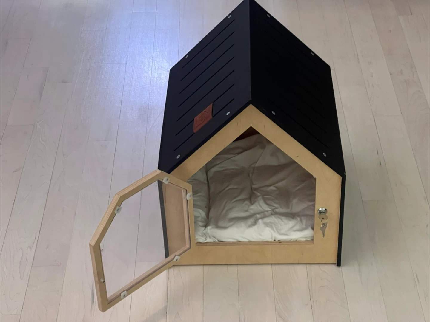Stylish modern dog house. Lightly used and in great condition. Selling because our puppy decided to not like crating anymore. Comes with locking transparent door and cushion. Good for a puppy or dog up to about 12 pounds. $268 new (Etsy)