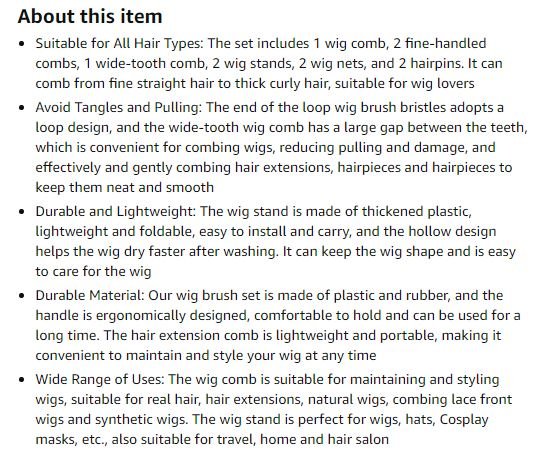 Suitable for All Hair Types: The set includes 1 Wig brush, 2 Handled combs, 1 Wide-tooth comb, 2 Wig stands, 2 Wig nets, and 2 Hair clips. It can comb fine straight hair to thick curly hair, suitable for wig lovers.
