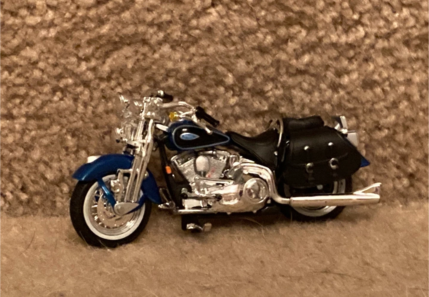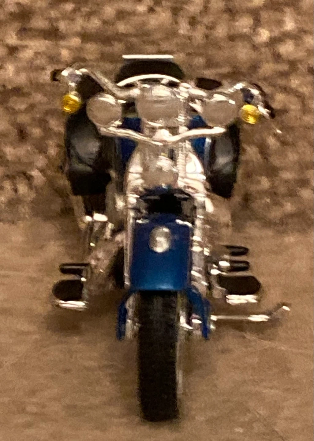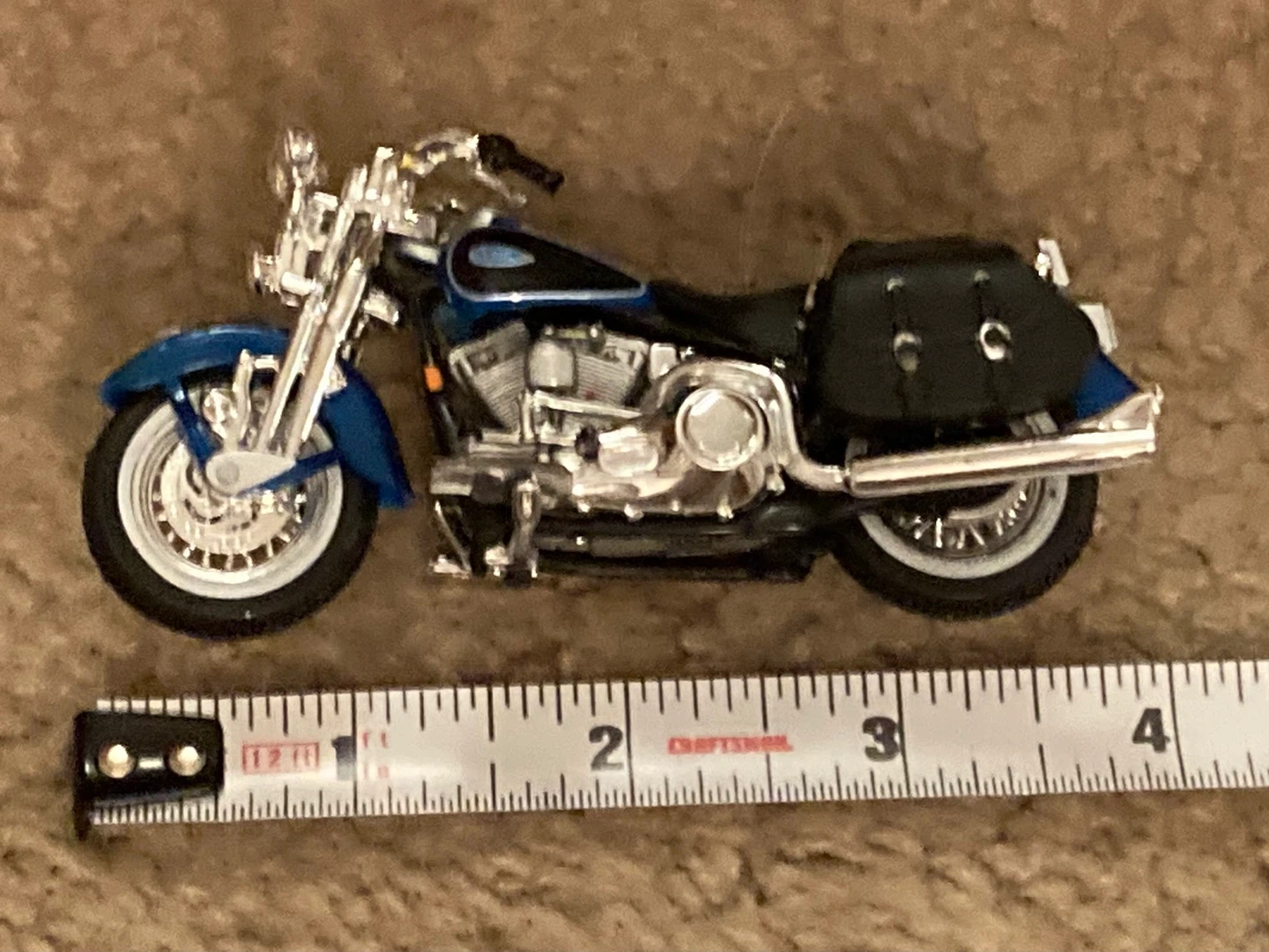 Here's a cool motorcycle model in blue and black. It's a Mojito brand model, measuring about 4 inches in length. A fun collectible! Die cast toy