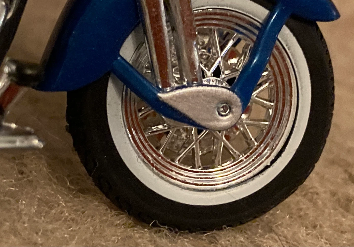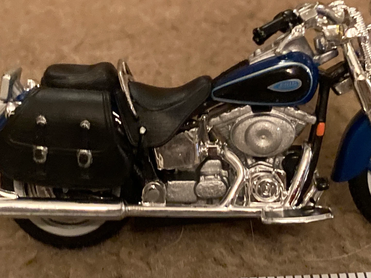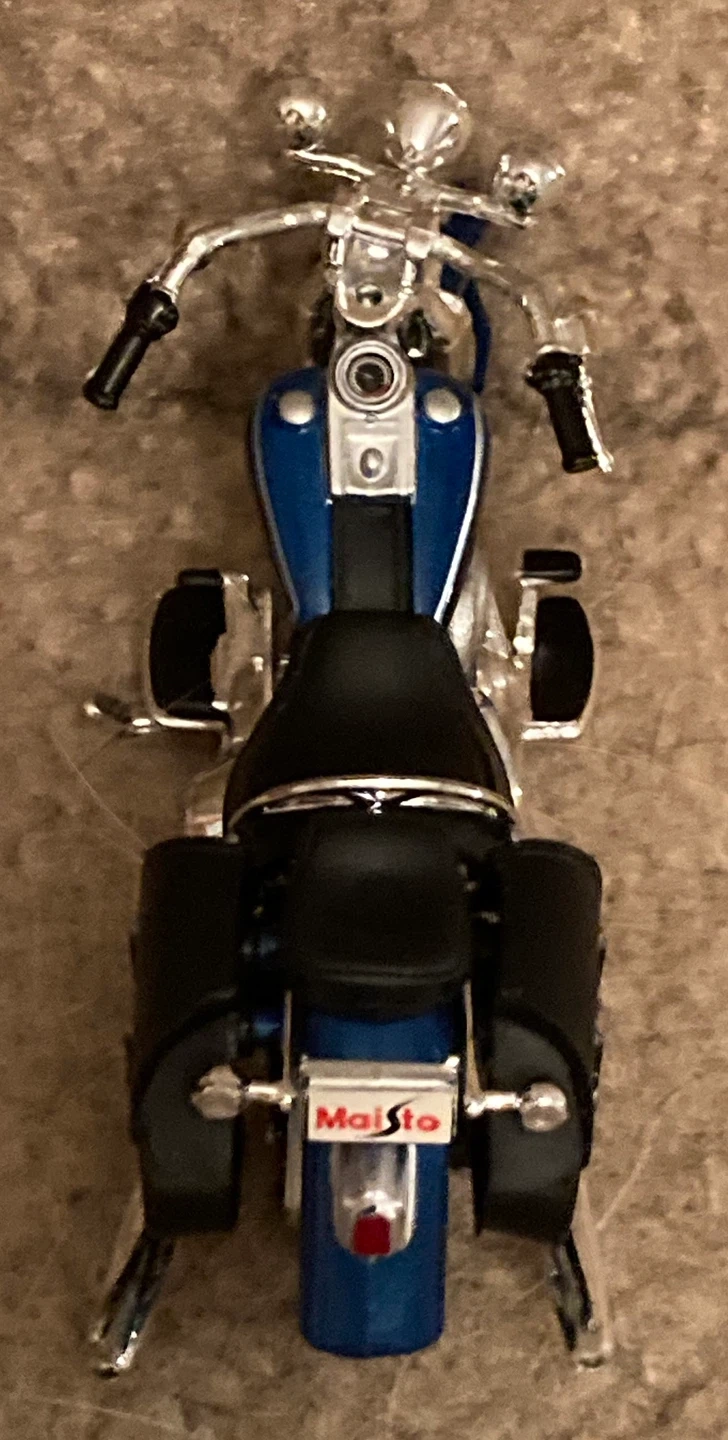 Here's a cool motorcycle model in blue and black. It's a Mojito brand model, measuring about 4 inches in length. A fun collectible! Die cast toy