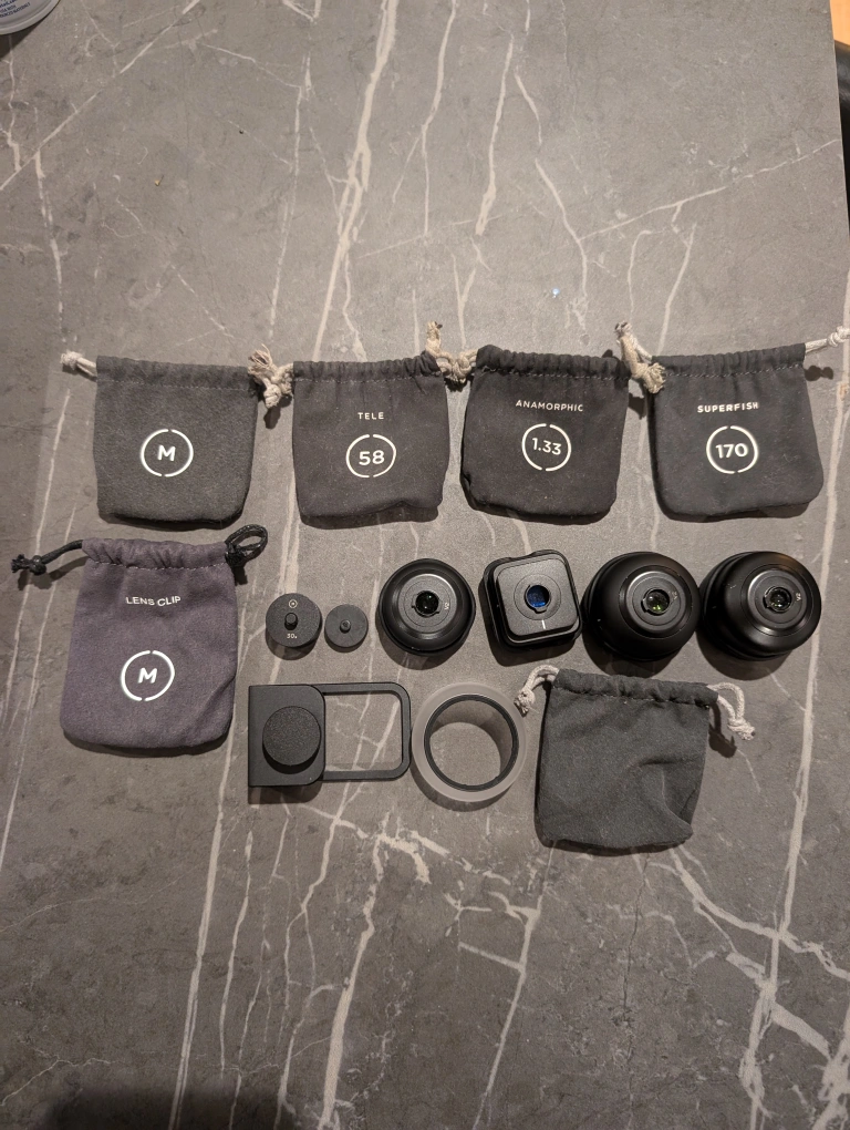 29Set of moment lenses and accessories, phone mount adapter, and counter balances, and catering bags Fisheye superfish 170 degree Wide 18mm Lens Tele 58mm Lens Anamorphic Lens 1.33 All retailed for over $500 but from a few years ago so willing to let go for a fraction of the cost, they still all work pretty well Includes carrying cases for all lenses and a clip for attaching lenses to a phone. Also comes with a lens cap and adapter.