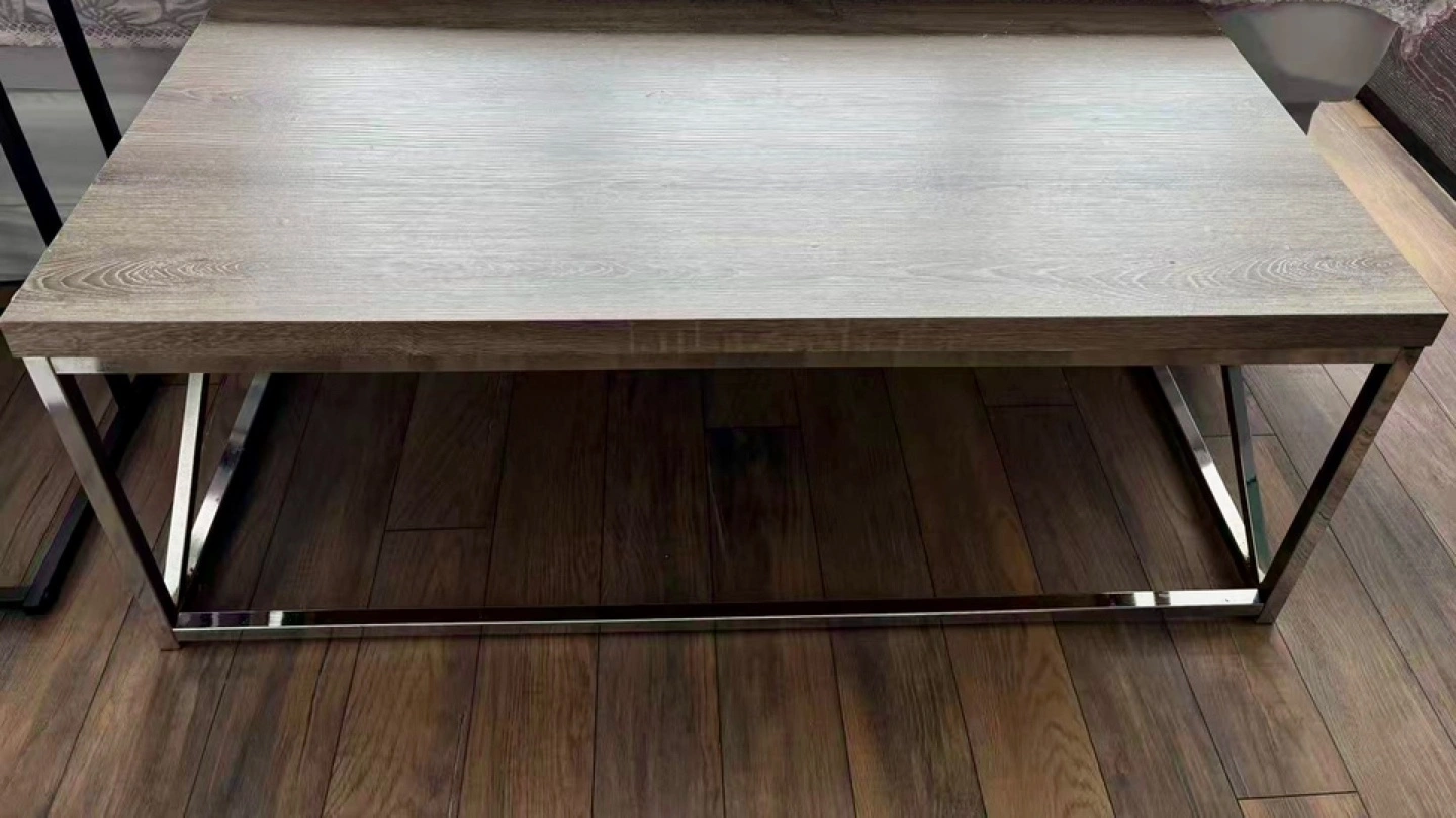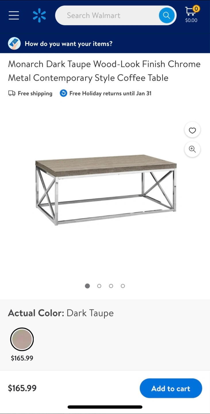 Selling a Monarch coffee table with a dark taupe wood-look finish and chrome metal accents. It's a contemporary style that would look great in any living room. Originally bought for $165.99