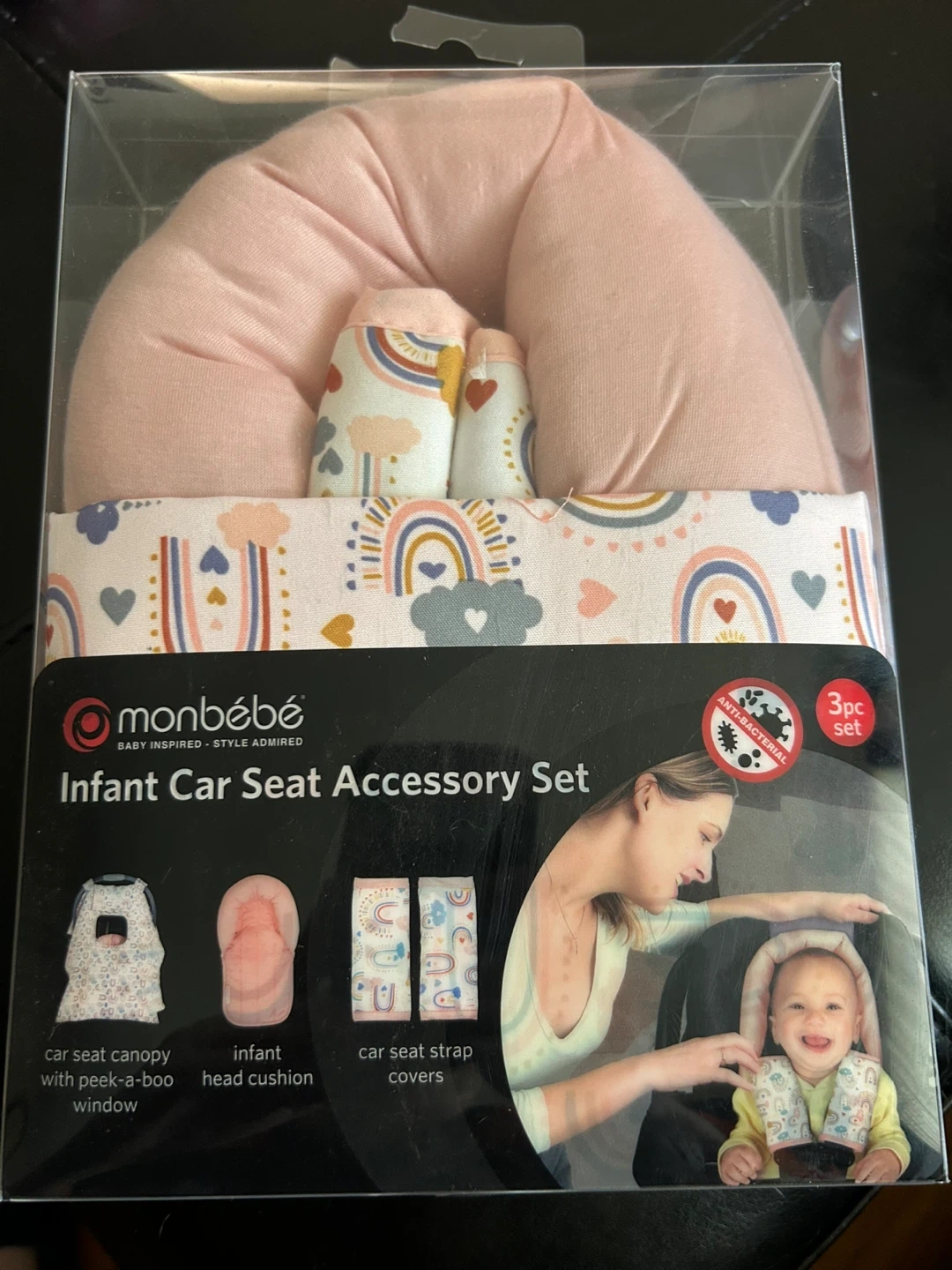 Selling a brand new Monbebe Infant Car Seat Accessory Set! This 3-piece set includes a car seat canopy with a peek-a-boo window, an infant head cushion, and car seat strap covers.