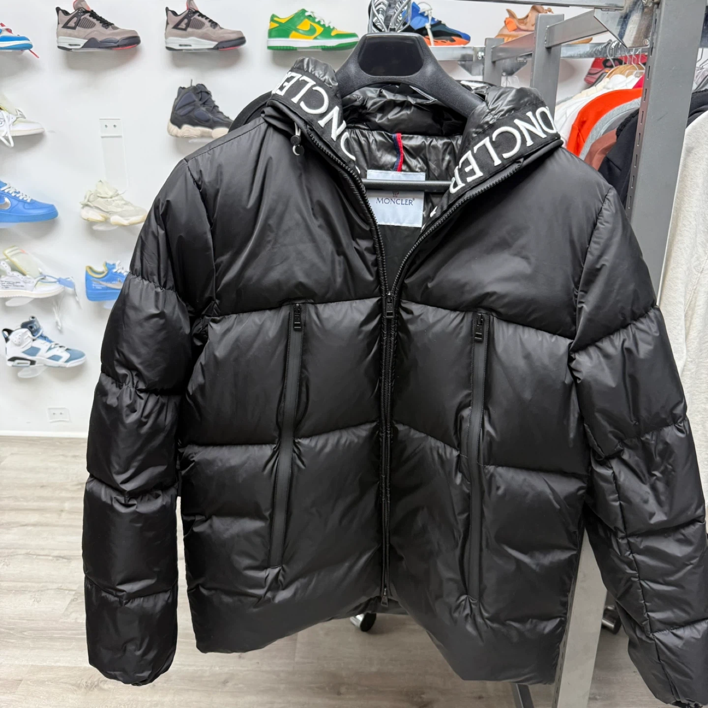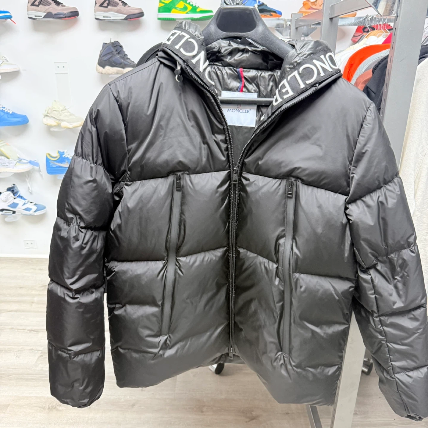 Selling a stylish Moncler black padded down jacket. It's in great condition and perfect for staying warm in colder weather. The jacket features a hood with Moncler branding and a sleek design with functional pockets. A must-have addition to your wardrobe for both style and practicality