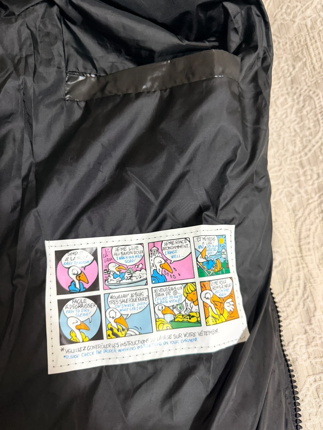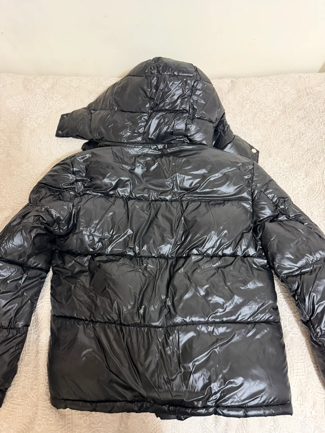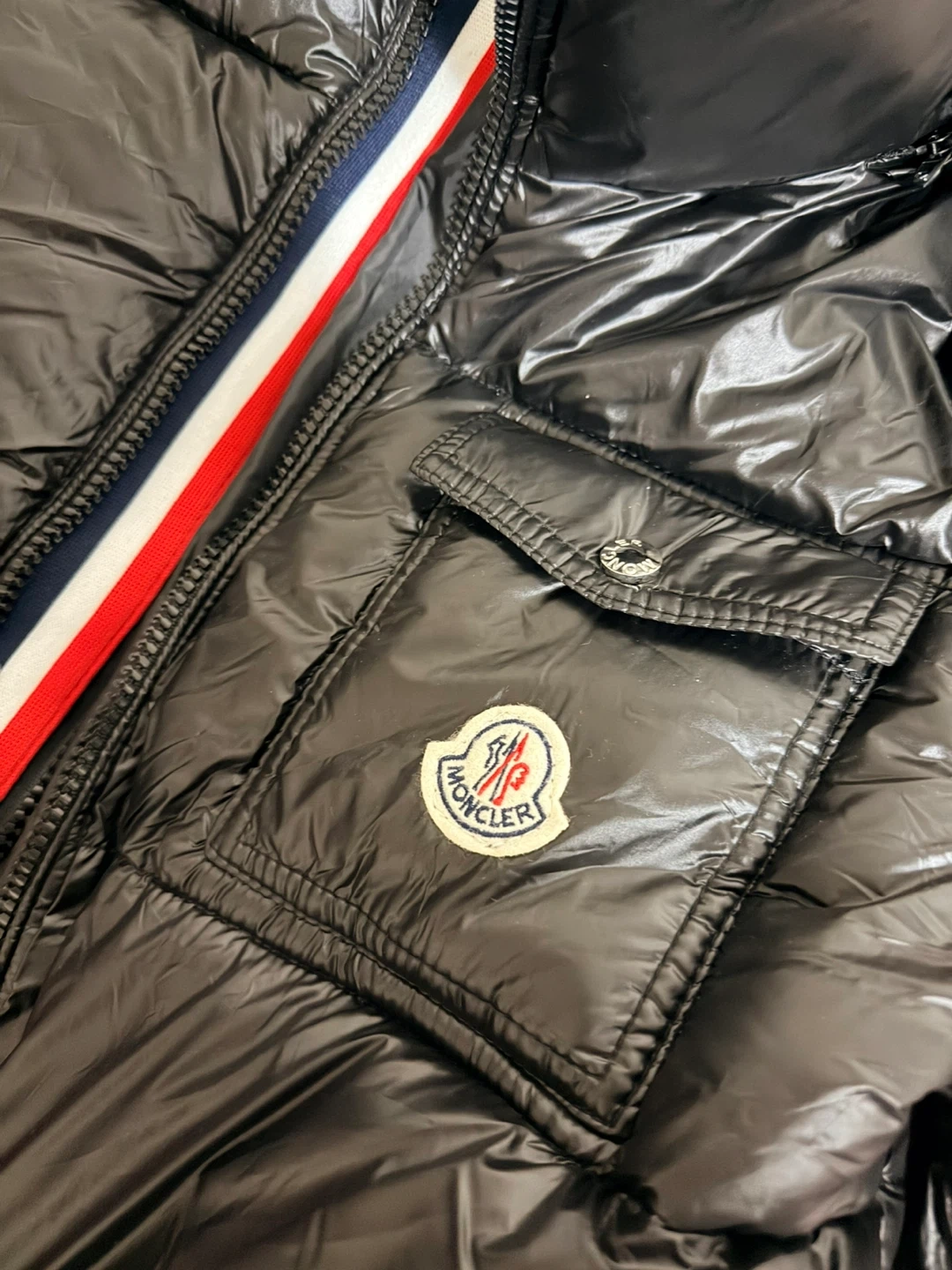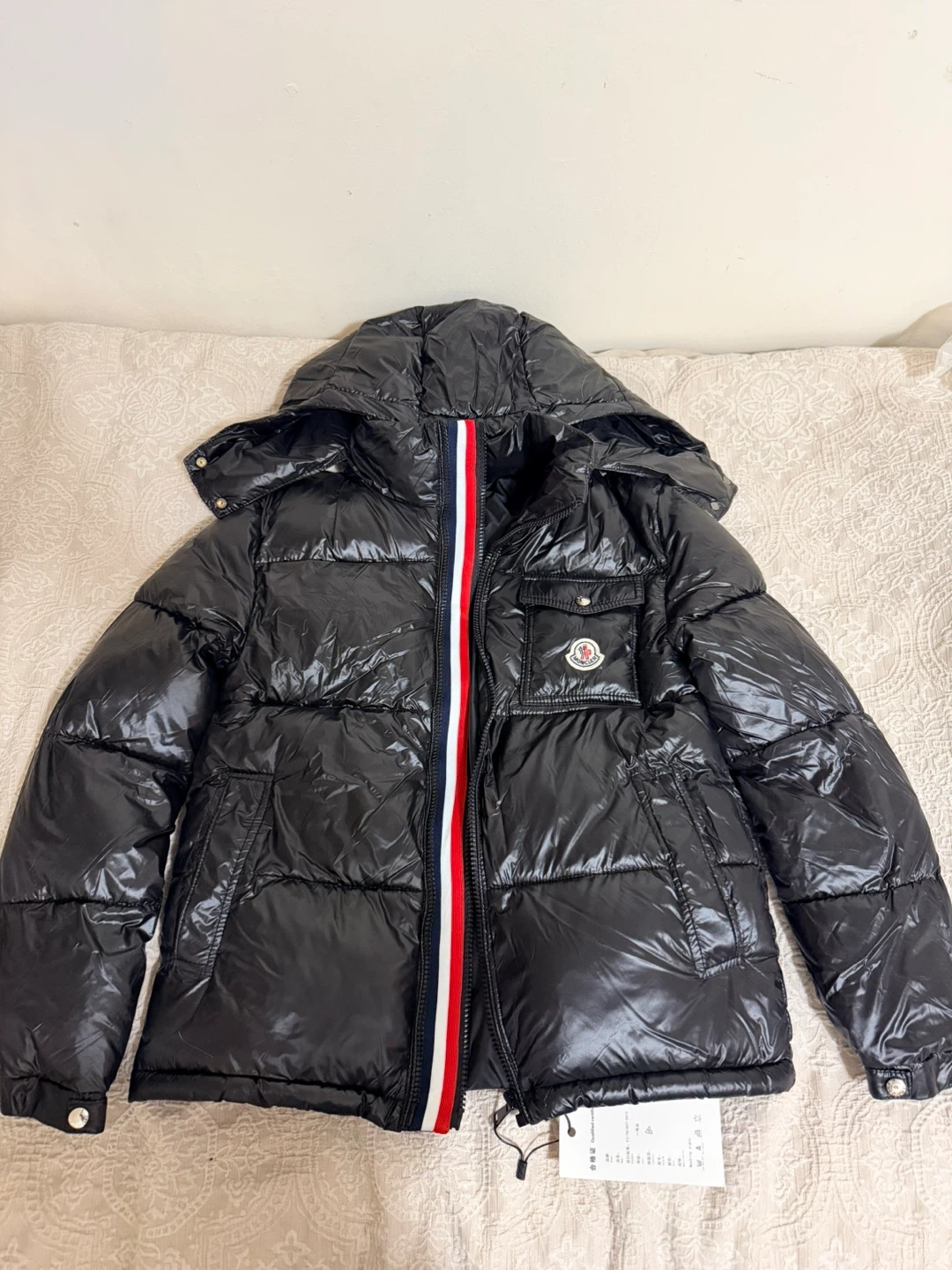 Selling a stylish Moncler puffer jacket in black. It features a unique red, white, and blue stripe detail. This jacket is perfect for staying warm and fashionable during the colder months. Feel free to ask any questions! It still has the tag on it,Chinese company.
