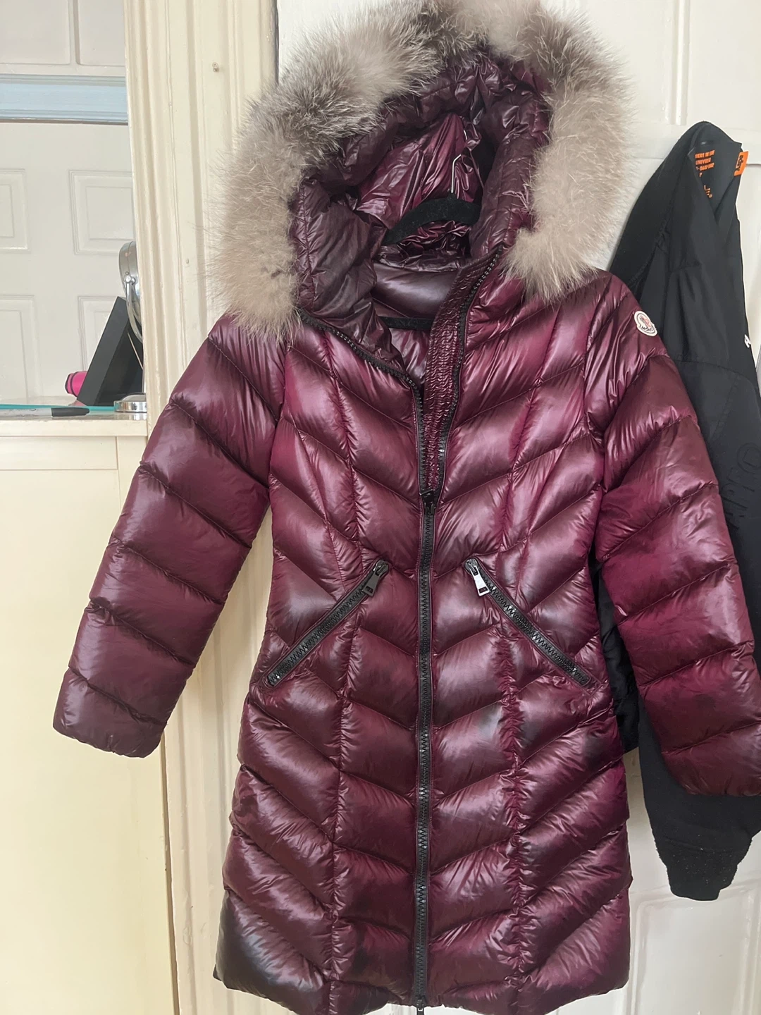 Selling a Moncler down padded jacket. The jacket is a beautiful deep purple color and features a fur-trimmed hood. It's in good condition and ready to keep you warm!