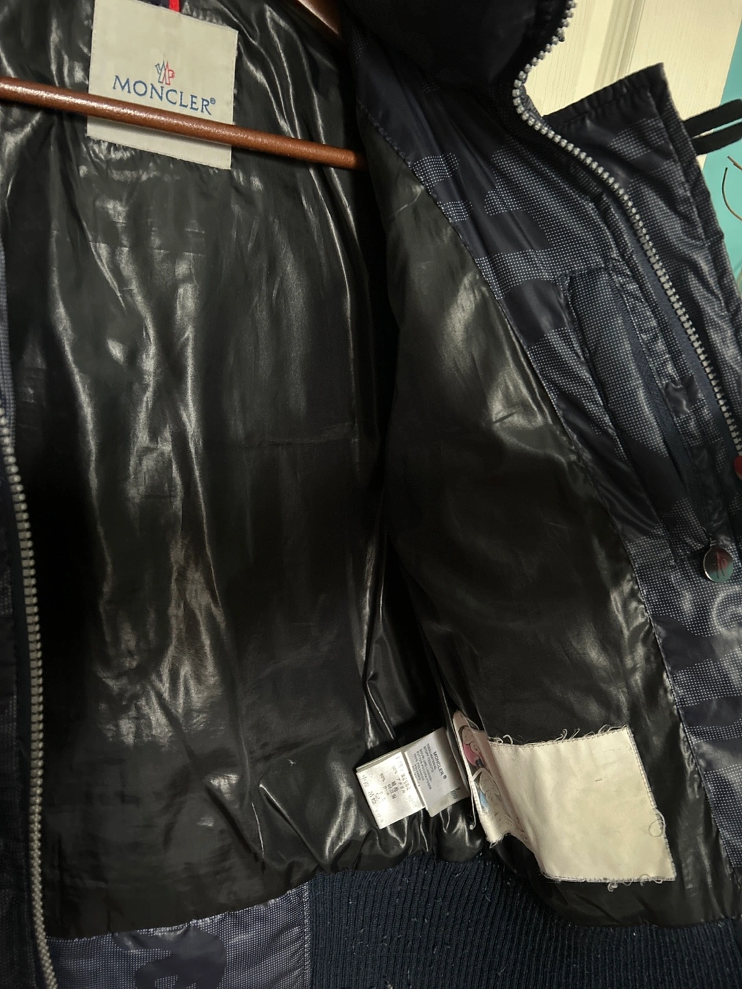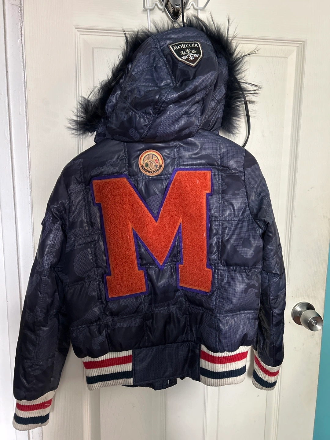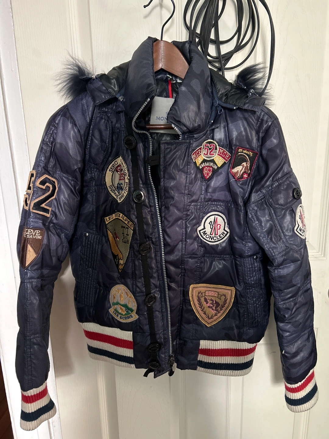 Navy blue puffer jacket. Features a faux fur-trimmed hood, multiple patches, and ribbed cuffs. Size 1/S. Made in Italy.