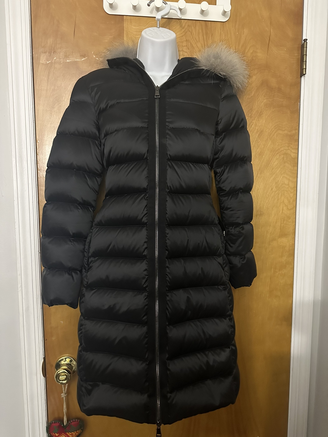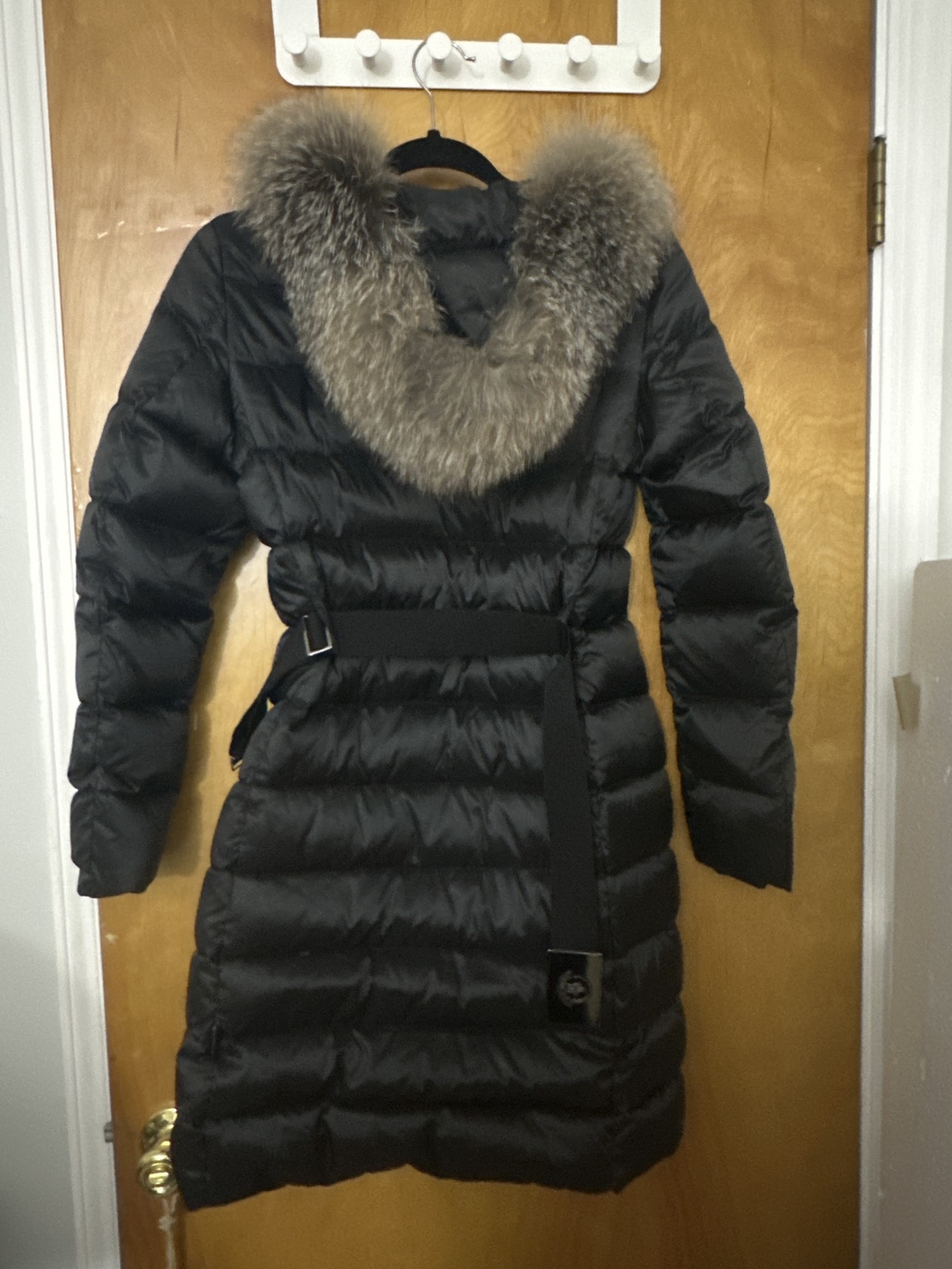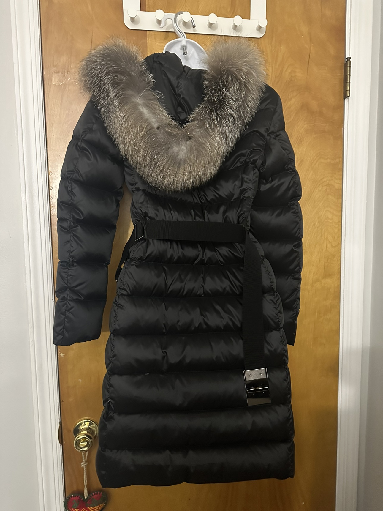 Moncler \"Tinuviel\" shiny quilted puffer coat. Hooded neckline with dyed fox fur (Finland) lining. Two-way zip front. Long sleeves; banded cuffs. Removable self-belt cinches waist. Straight hem hits at mid-thigh. Polyester/nylon; nylon lining; down/feather fill. Imported.