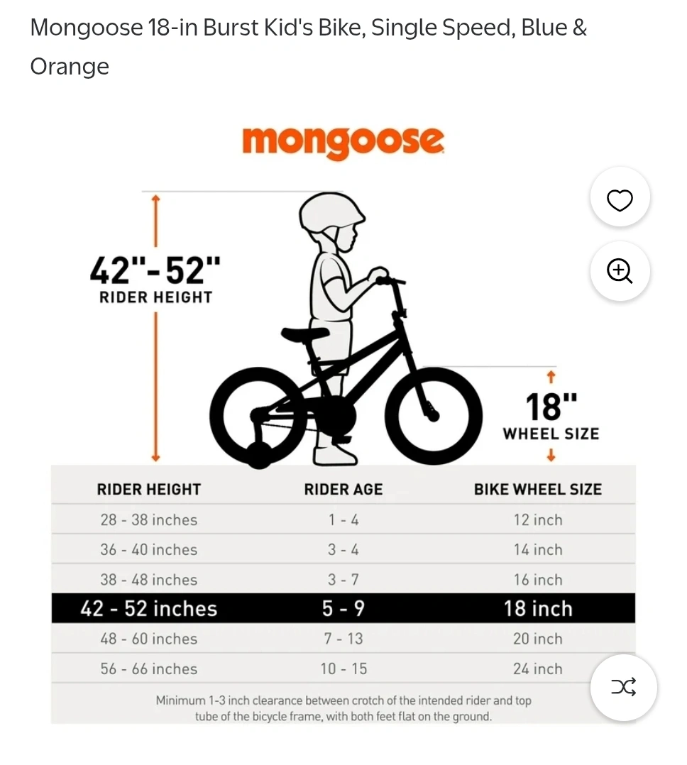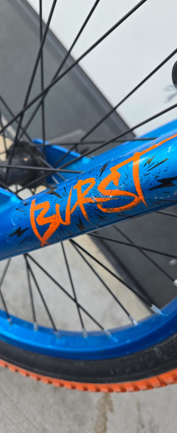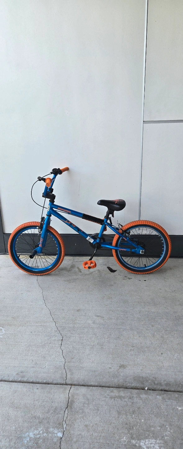 Single speed bike. Blue and orange. 18 inch wheels. Suitable for riders 42-52 inches tall.