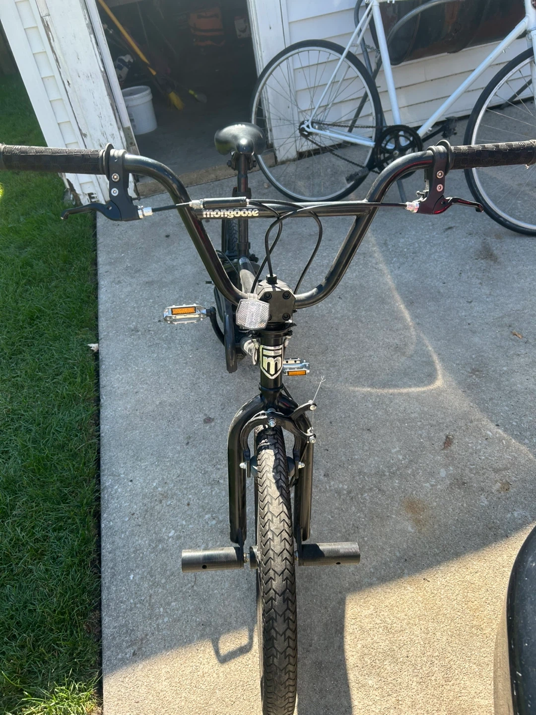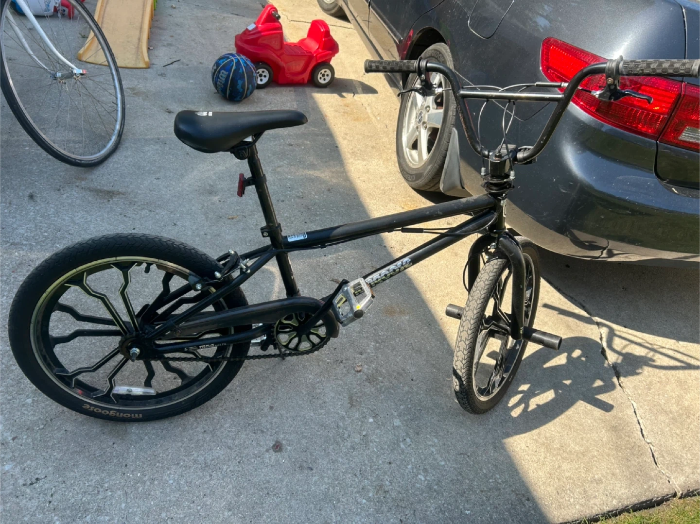Selling a Mongoose BMX bike in black. The tires are size 20 x 2.10. It's a great bike for tricks and getting around!