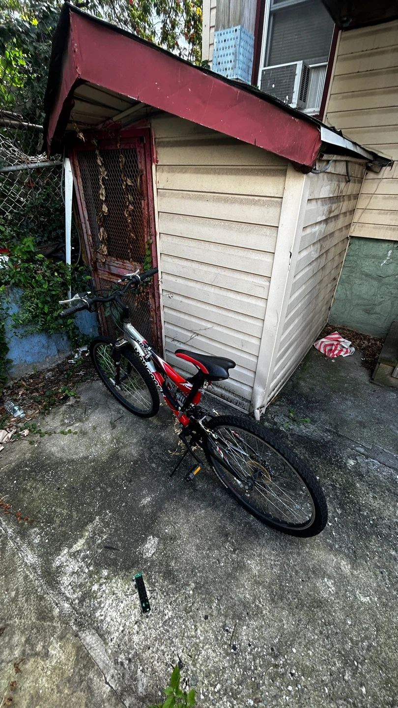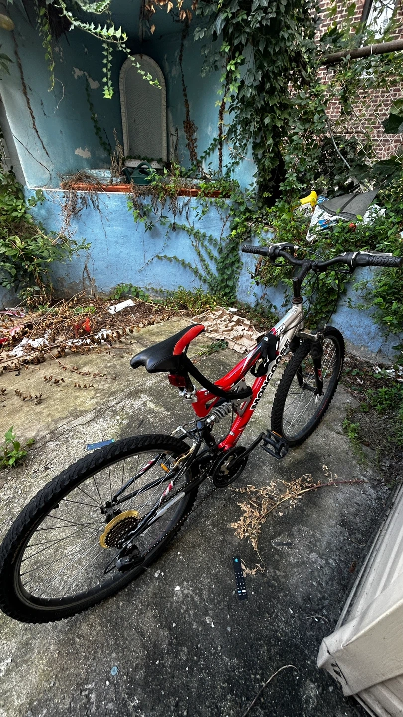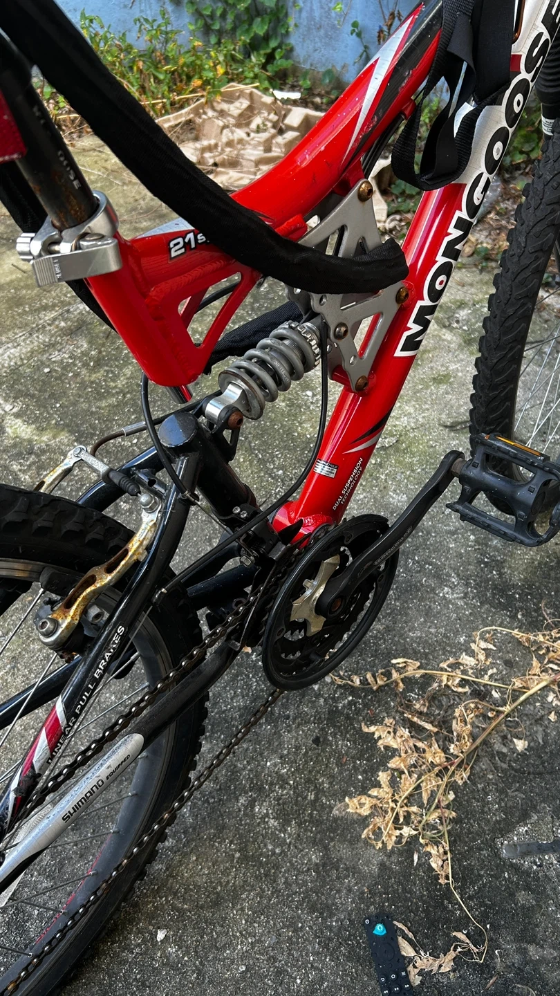 Selling a Mongoose mountain bike in red and black. It looks like it's in good condition and ready for some outdoor adventures!
