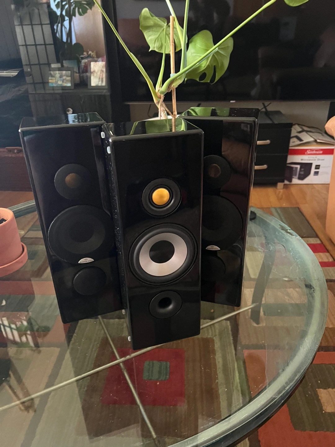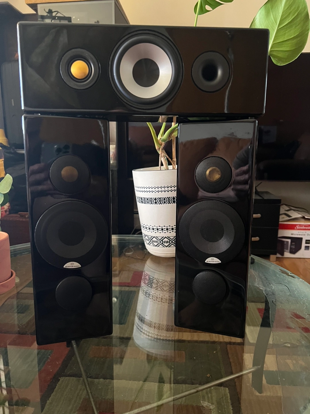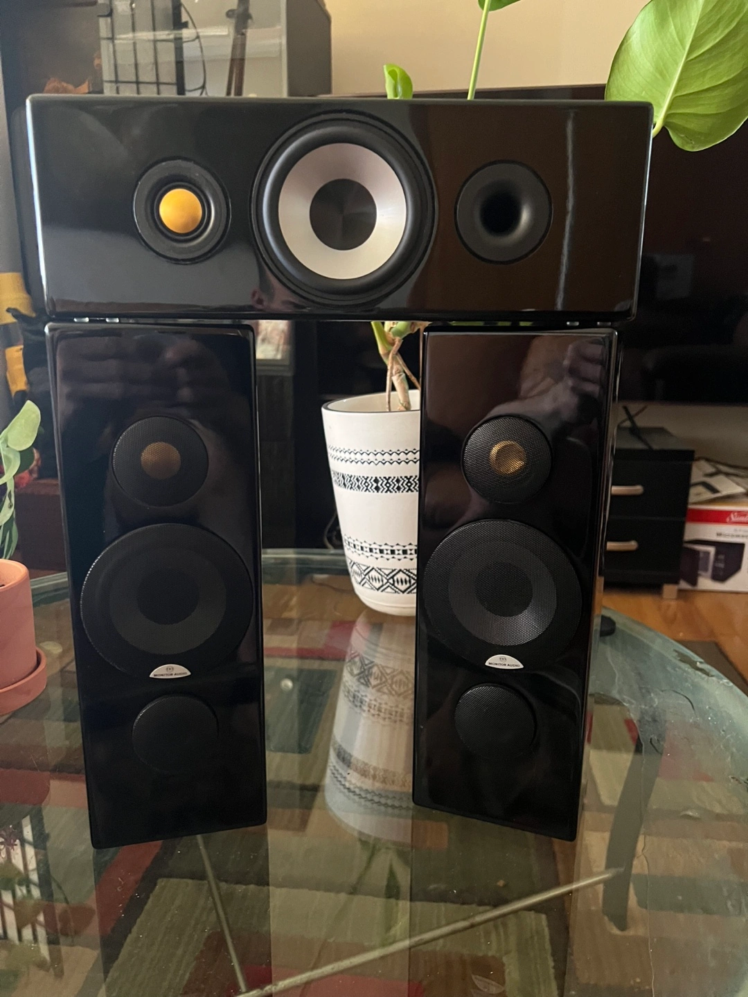 Black high gloss finish. Excellent sound quality. Includes 3 speakers only . Great for home theater setups.