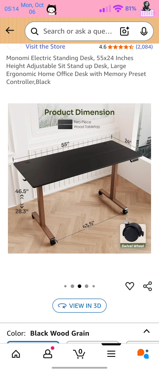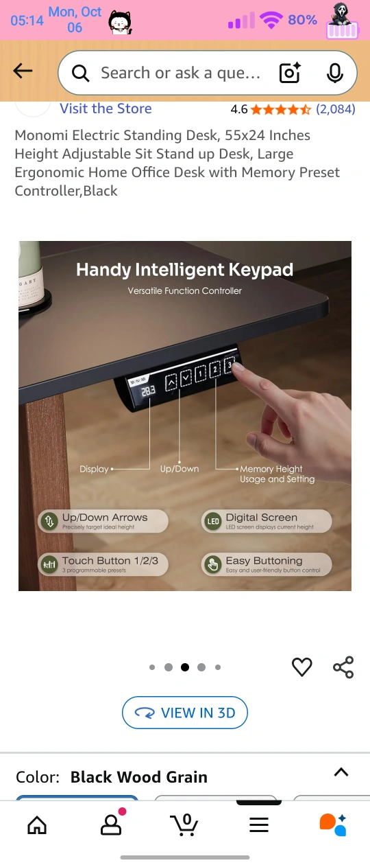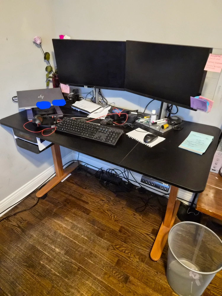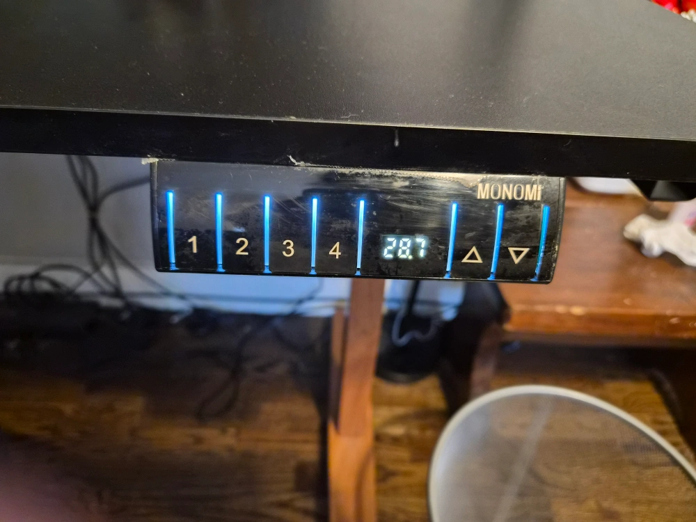 Selling a Monomi electric standing desk in black with wood grain. It's 55x24 inches and has an adjustable height. It's a great ergonomic desk for a home office with a memory preset controller.