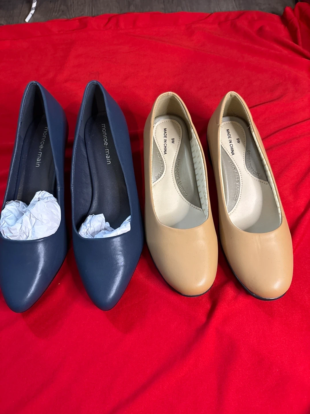Two pairs of monroe main pumps available in size 9W One pair is navy blue and the other is tan