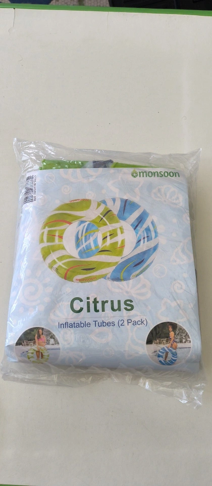 Two inflatable tubes are included in the package. The packaging shows a blue and green design. These tubes will be great for a nice relaxing day floating in the water. Enjoy the ultimate pool or beach experience with this 2-pack of luxury pool floats. These swimming floats are made of high-quality vinyl material and come in a beautiful blue-green color. Measuring 32.67"L x 32.67"W x 7.87"H, these floats are perfect for unisex adults who want to enjoy a fun and relaxing day in the water. Citrus 2PK floats are a must-have for anyone who loves outdoor toys and structures. The item package dimensions are 10.16 x 7.99 x 2.44 inches, and the floats weigh 1.3 pounds each. So, gather your friends and family and get ready for a fun-filled day at the beach or pool with these Citrus2PK luxury pool floats.