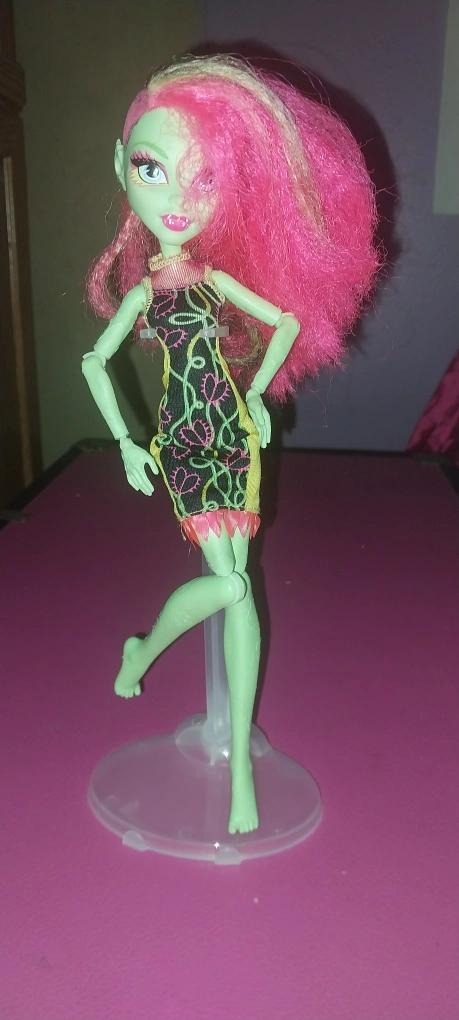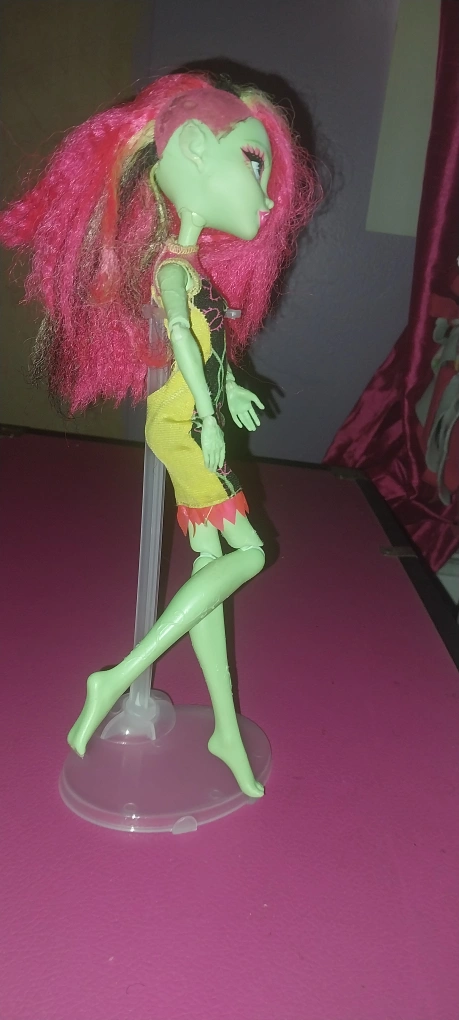15Selling a used Monster High Venus McFlytrap doll. She has pink hair and a green body. She is wearing a black and yellow dress with pink accents.