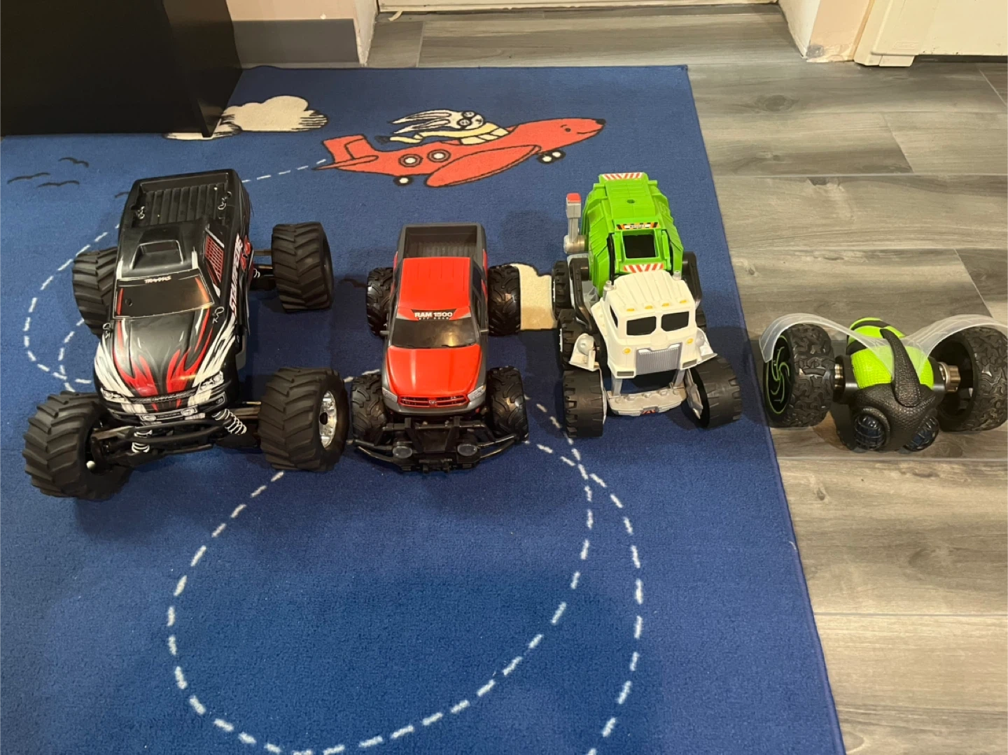 15Selling a lot of 4 monster trucks! They are in good condition and ready for a new home. Includes a black Traxxas monster truck, a red Ram 1500, a green and white garbage truck, and a green and black spinning stunt truck