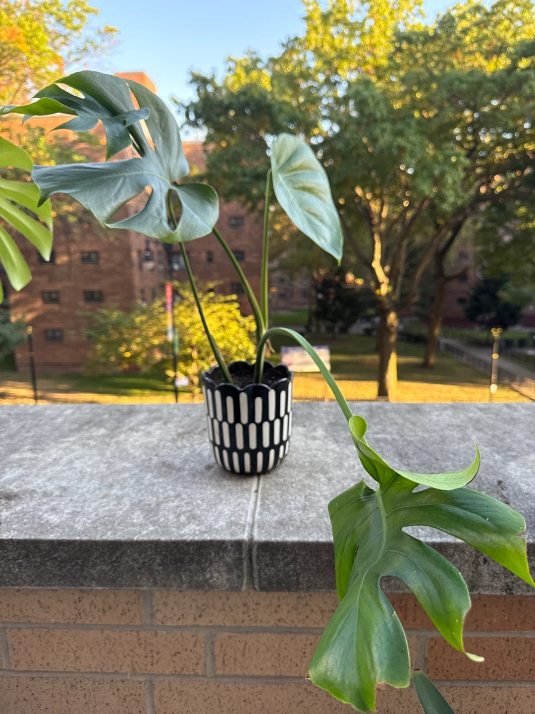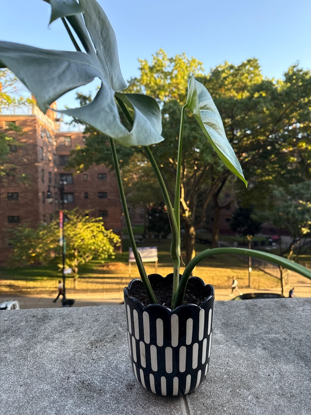 Selling a healthy monstera plant in a stylish black and white patterned pot. It's a beautiful addition to any home or office space. The plant is well-cared for and ready to thrive in its new environment Pot is 6”x6”