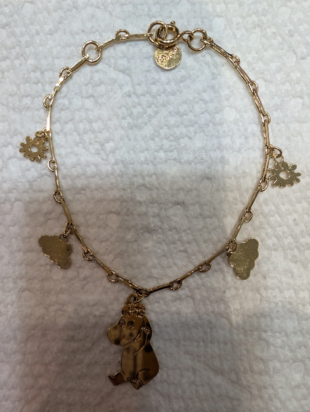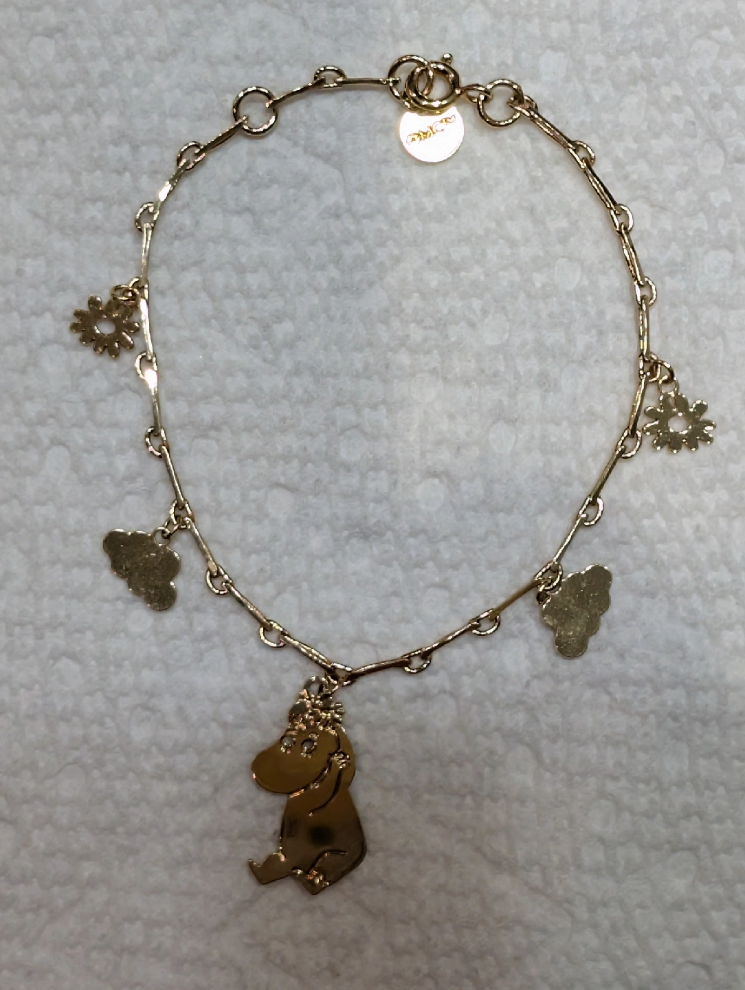 Selling a cute Moomin charm bracelet with Snorkmaiden cloud and flowers Moomin pendant along with cloud and flower charms in a 24 KT gold plated brass . Made in Germany