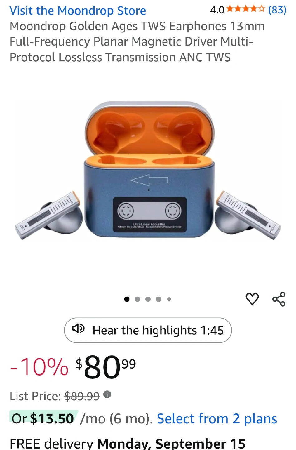 Selling a pair of Moondrop Golden Ages 1979 TWS earphones. They feature a 13mm full-frequency planar magnetic driver and support Bluetooth 5.3. The charging case provides about 18 hours of battery life, and the earphones themselves offer about 6 hours on a single charge. brand new sealed $50 must pickup on Staten Island