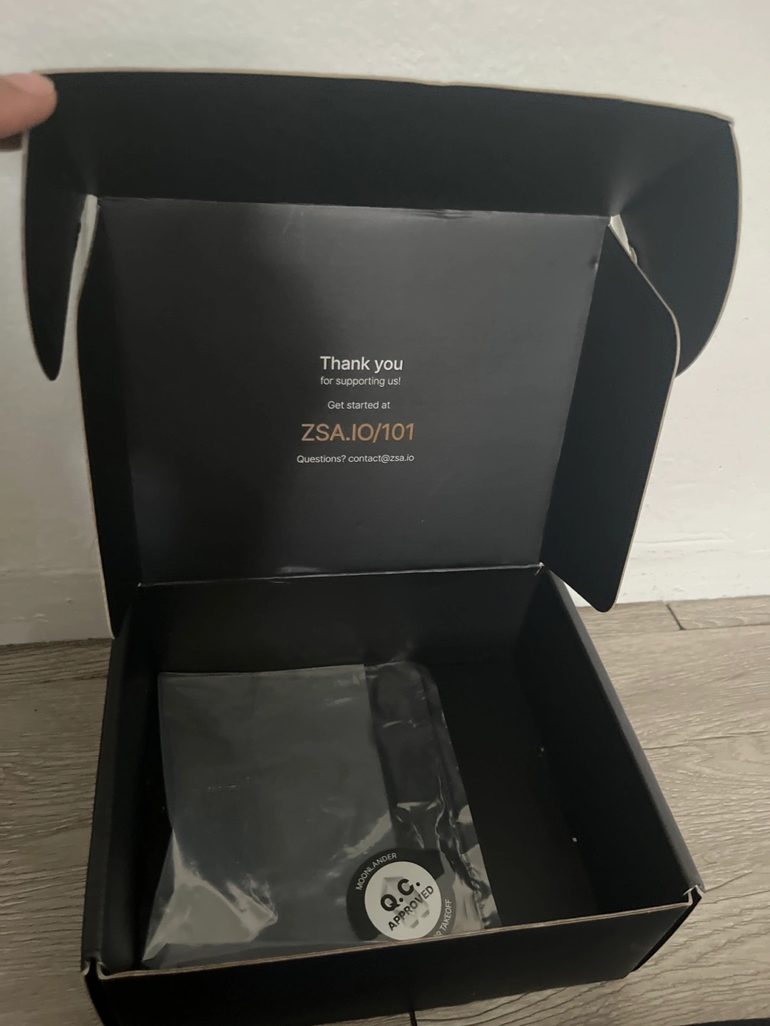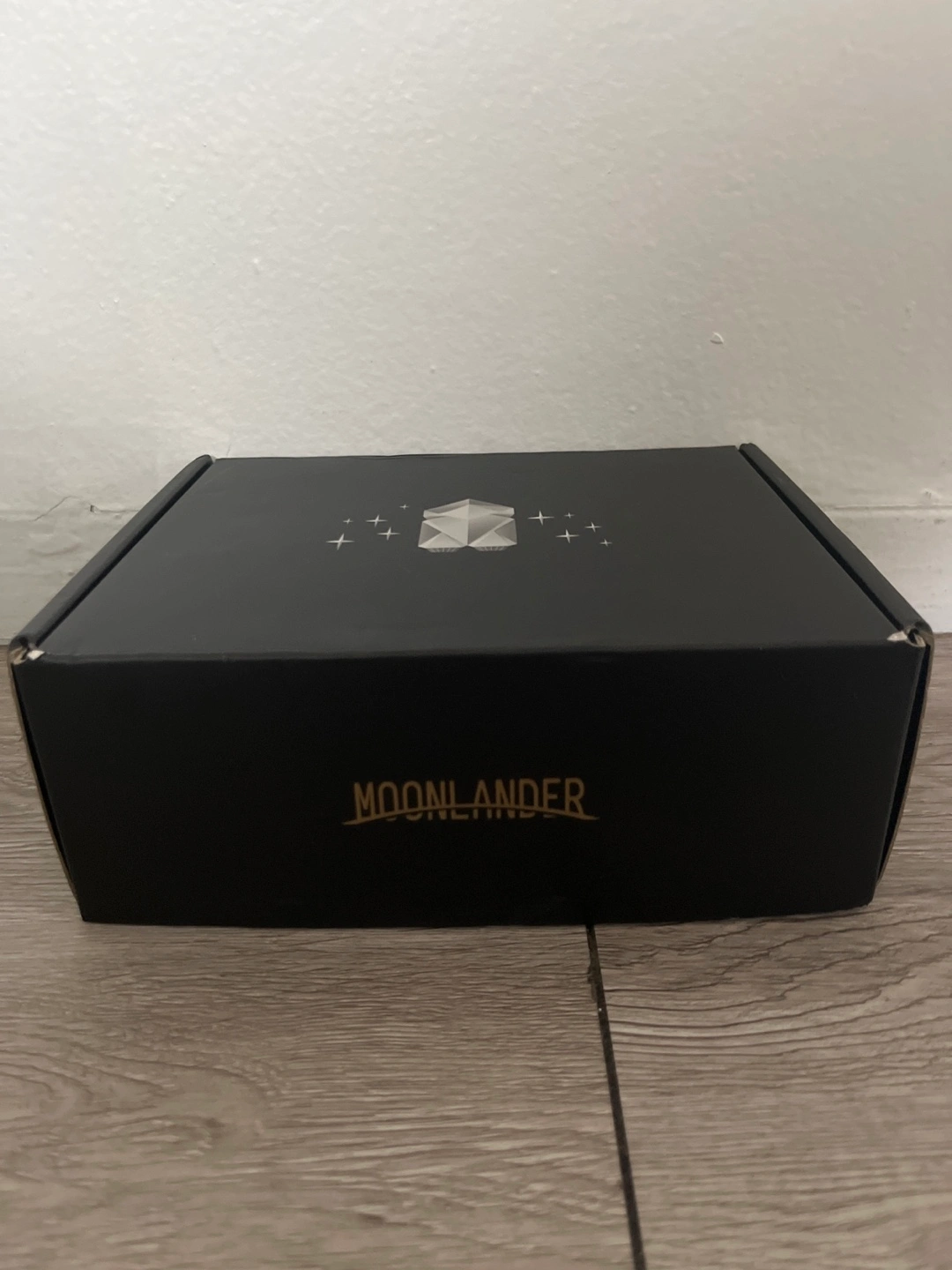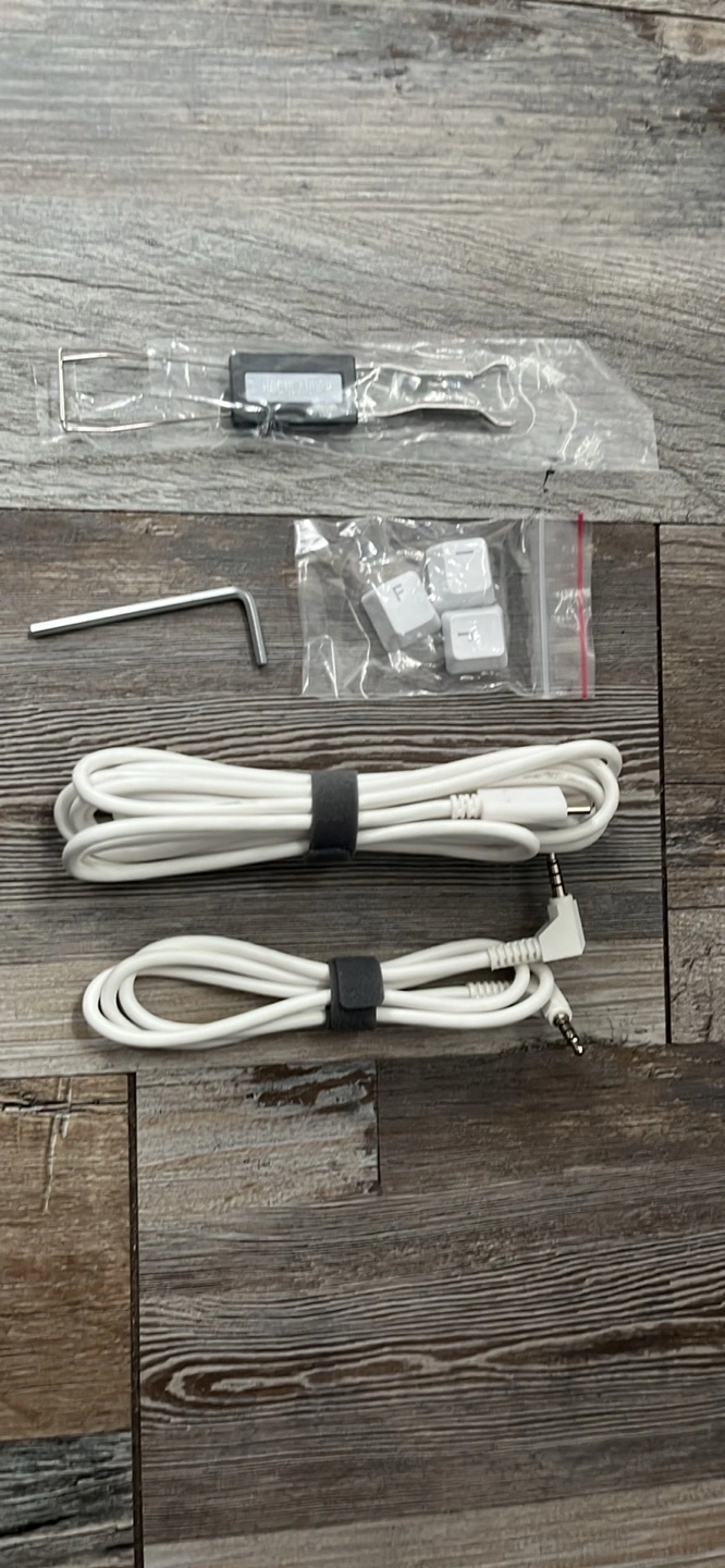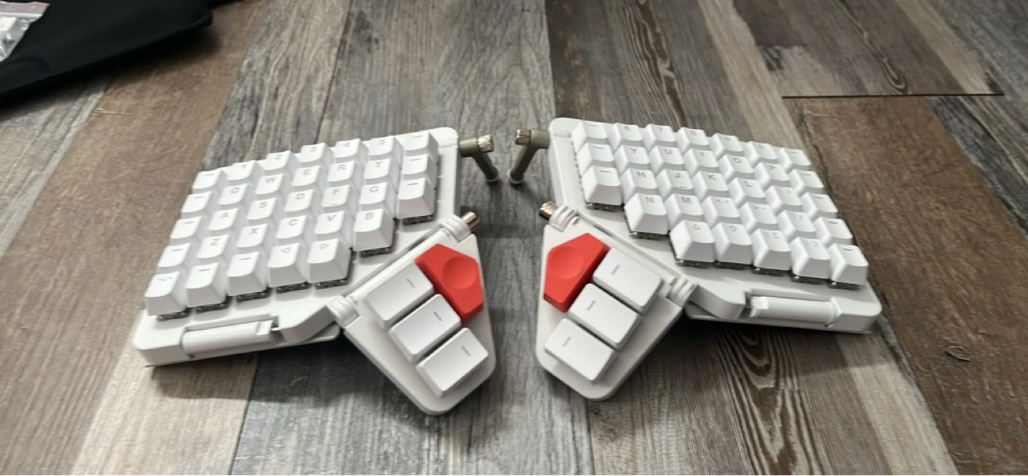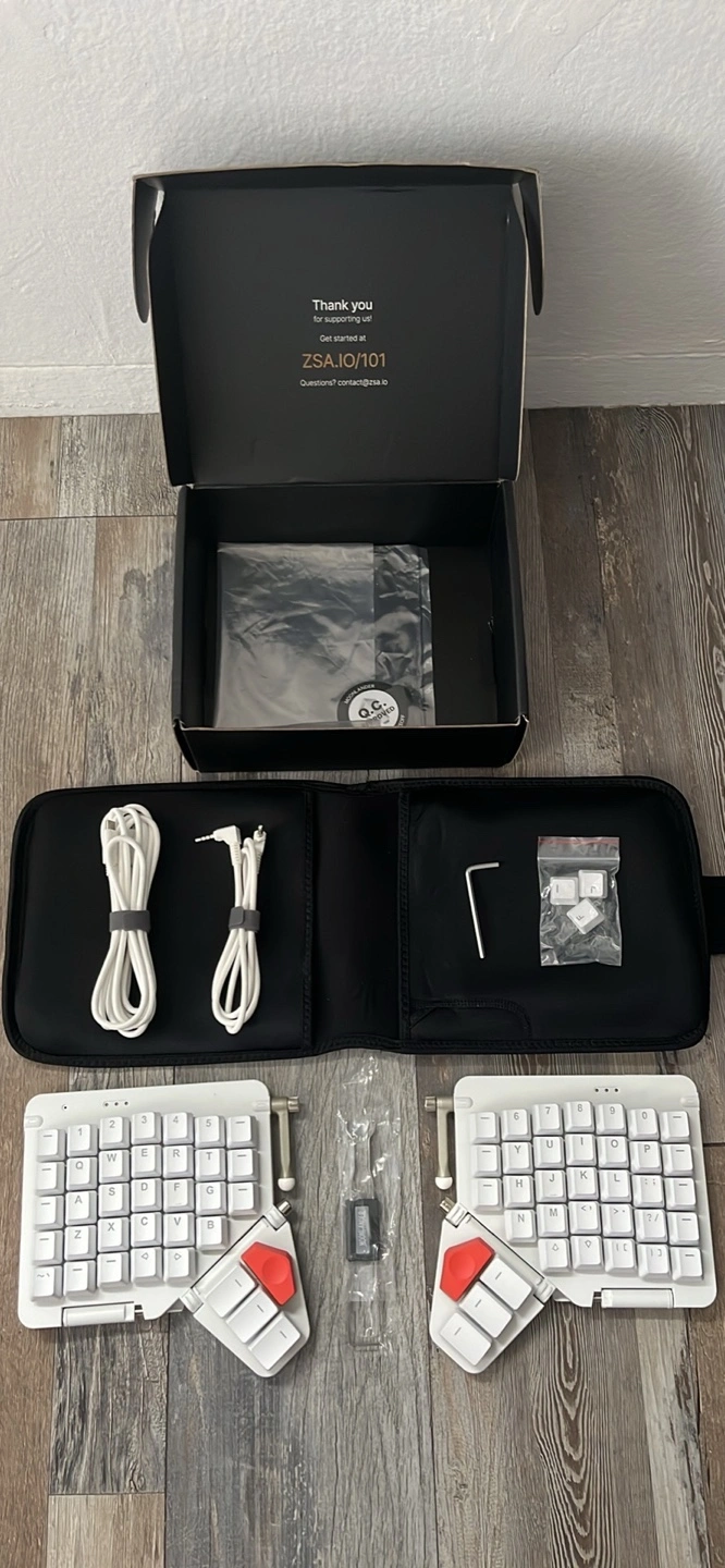 White Moonlander Mark II ergonomic keyboard. Includes two halves, cable, allen wrench, wrist rest, and extra keycaps. New condition, in original packaging. Cherry MX Brown switches.