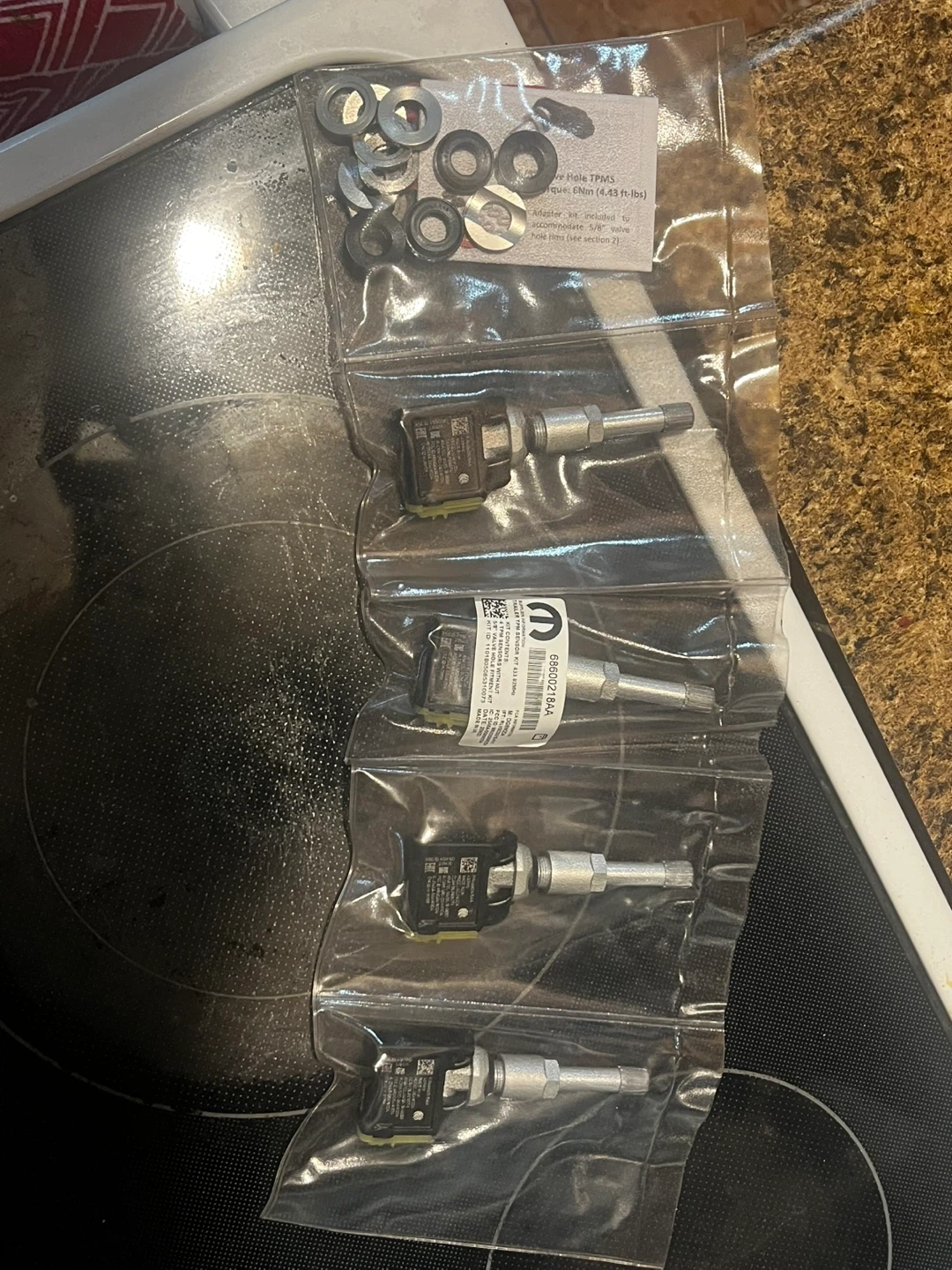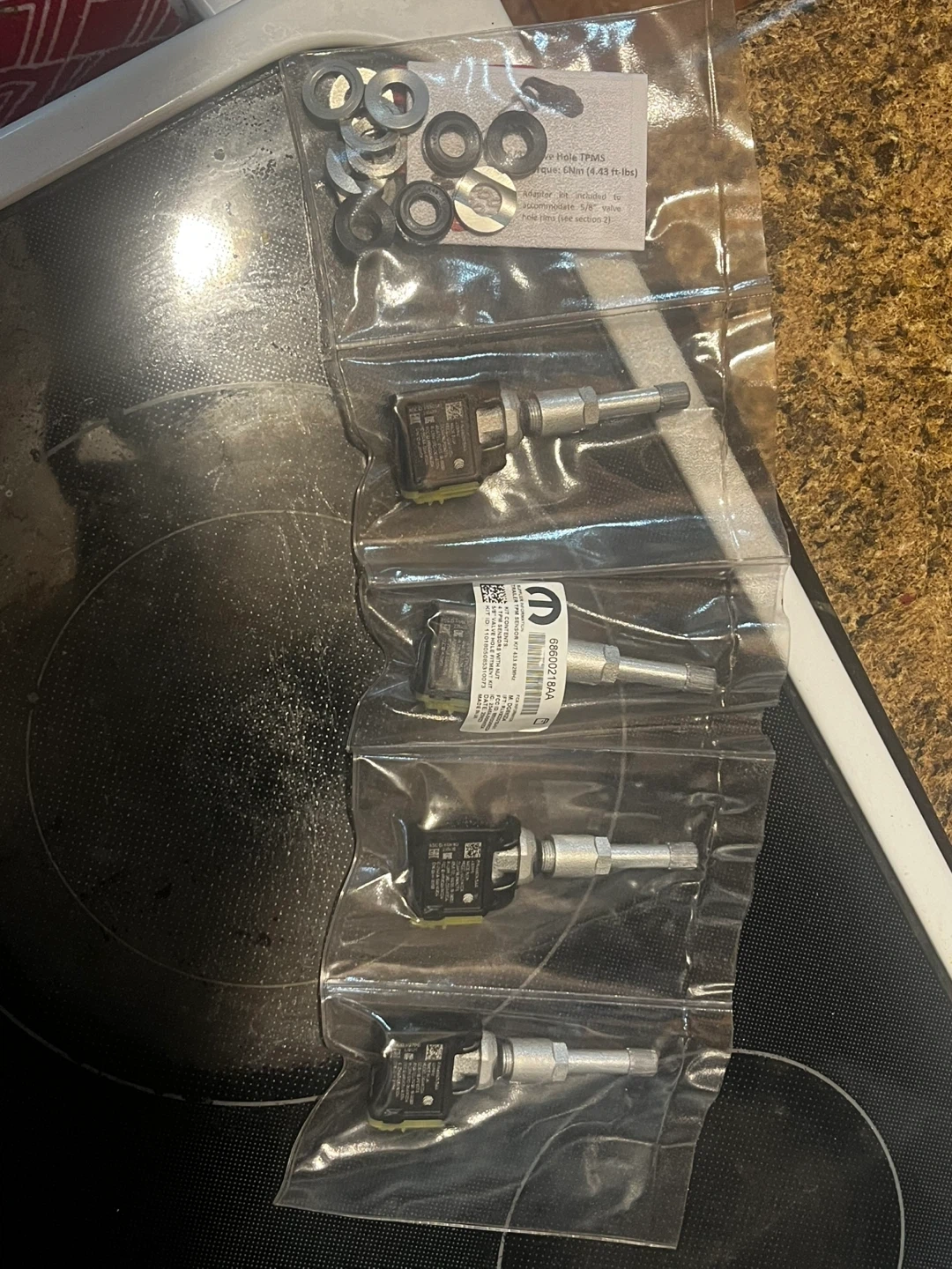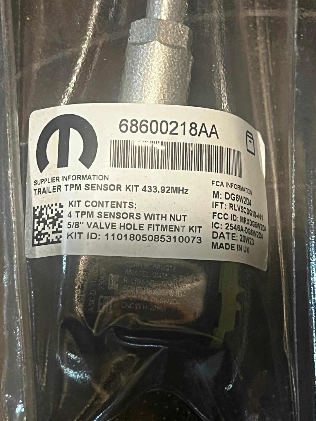 10Selling a new Mopar Trailer TPM Sensor Kit (part number 68600218AA). The kit includes 4 TPM sensors with nuts and a 5/8" valve hole fitment kit. It's designed for 433.92MHz systems.