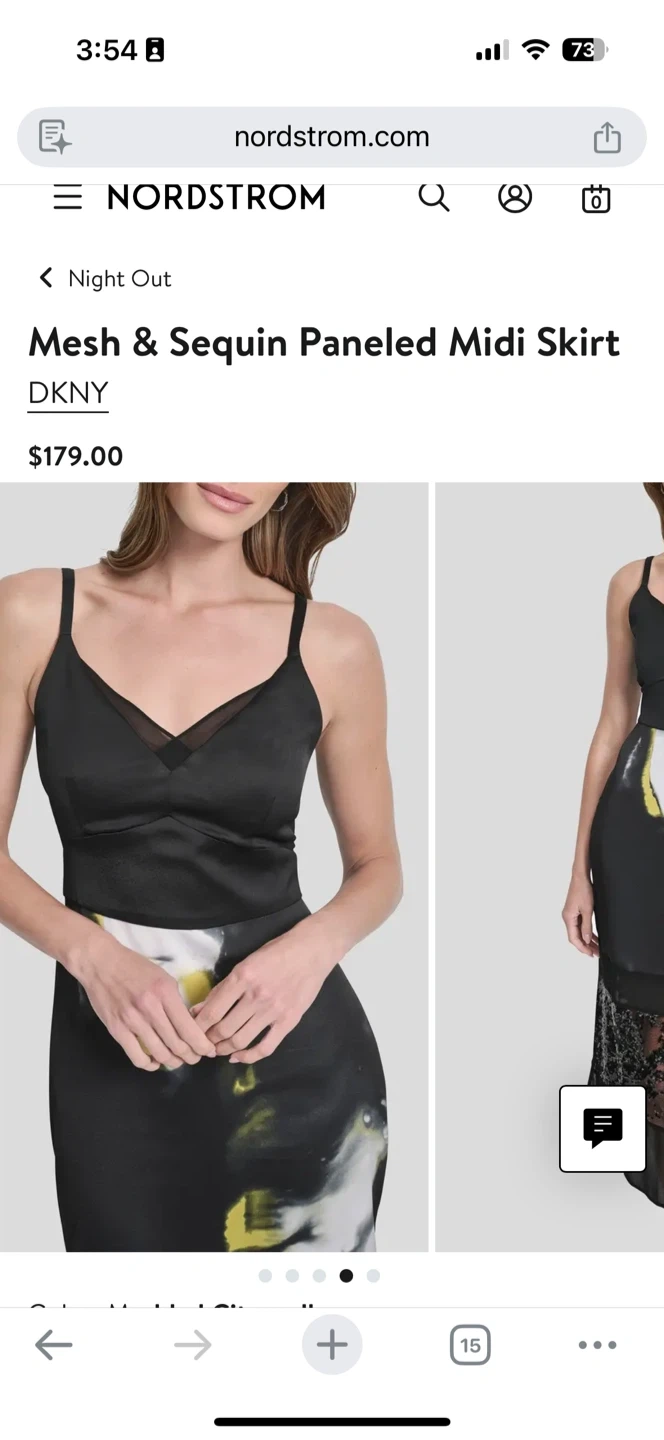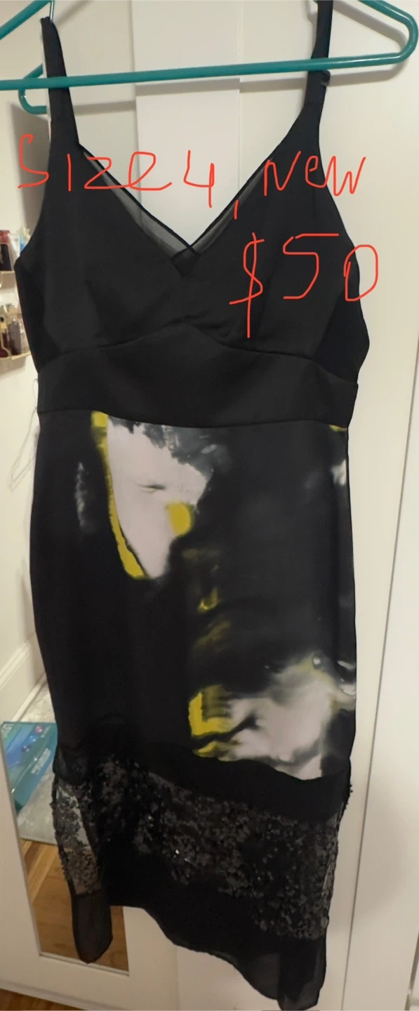 DKNY midi skirt with mesh and sequin paneling. Features a black base with abstract print. Size 4.
