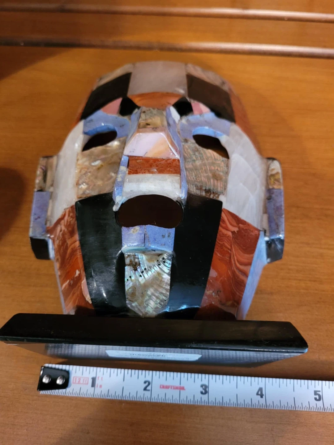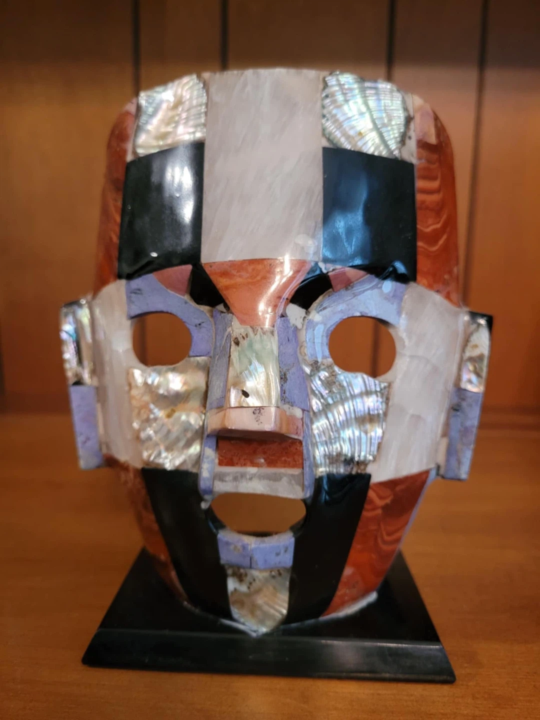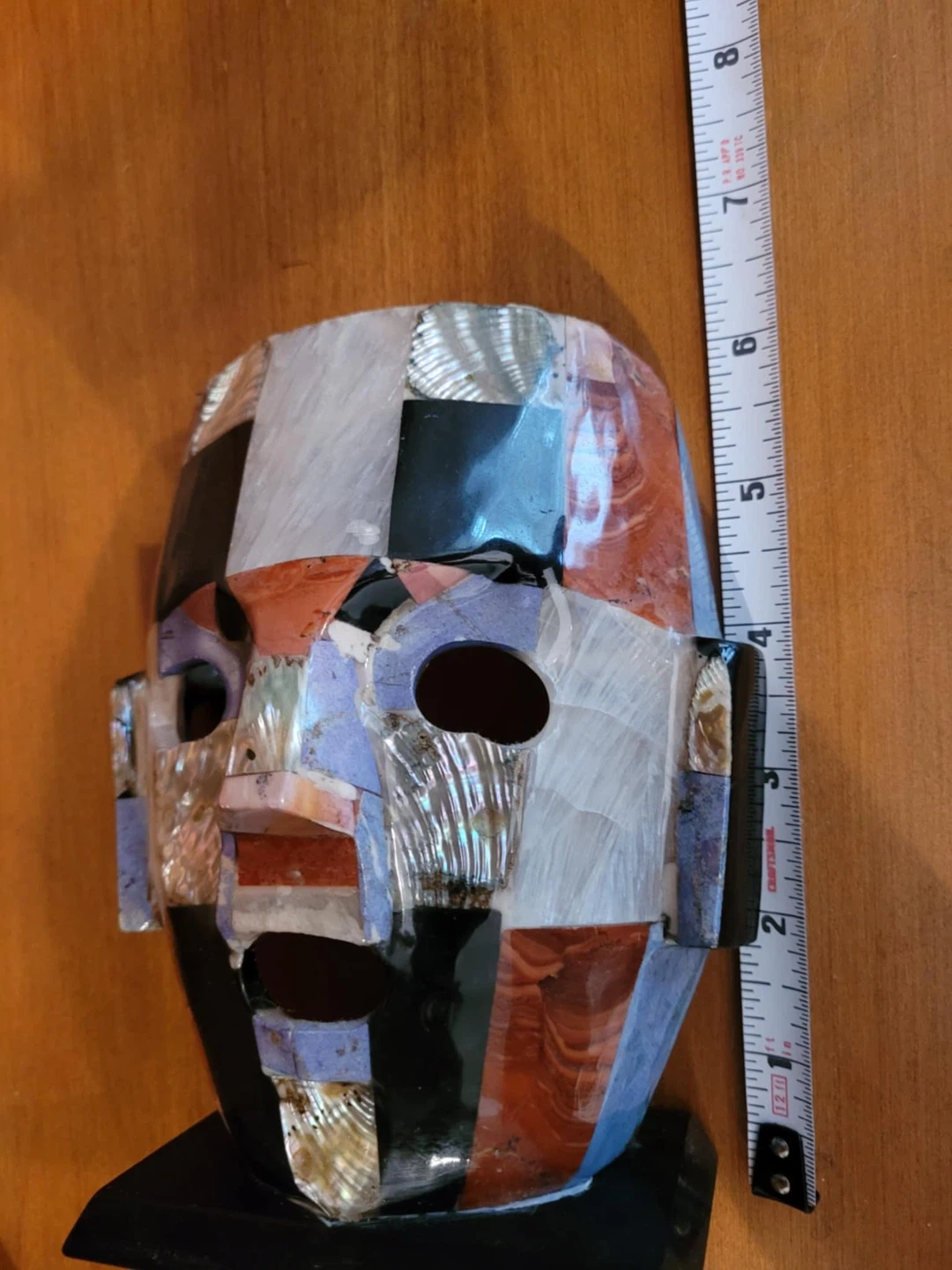 Unique mosaic stone mask sculpture! It features a variety of stones and shell pieces in a geometric pattern. The mask measures approximately 8 inches tall. A cool piece for any collector!