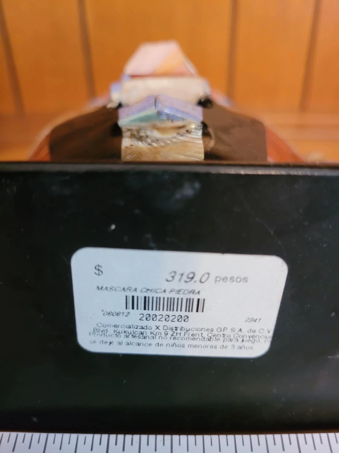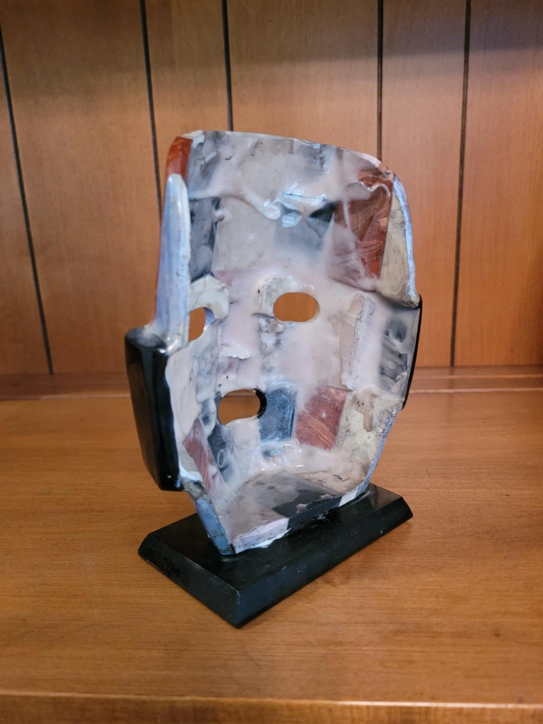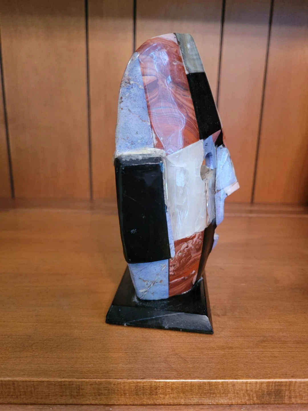Unique mosaic stone mask sculpture! It features a variety of stones and shell pieces in a geometric pattern. The mask measures approximately 8 inches tall. A cool piece for any collector!
